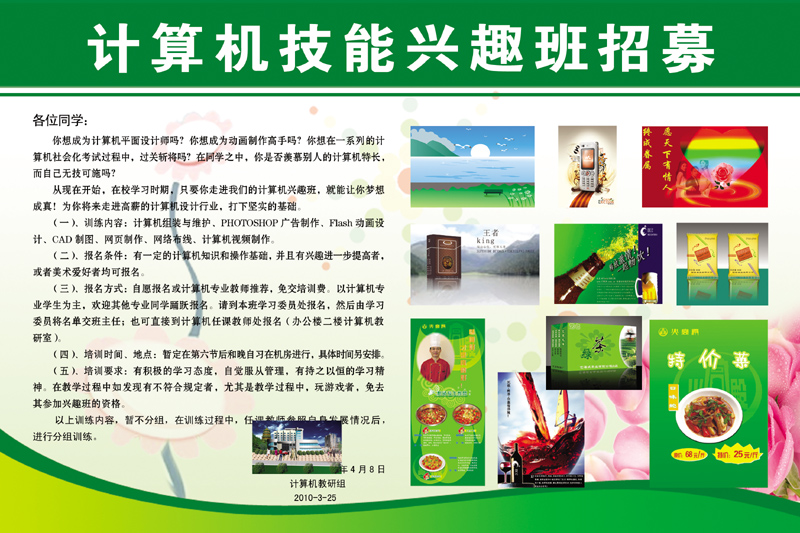(一)训练内容:计算机组装与维护、PHOTOSHOP广告制作、Flash动画设计、CAD制图、网页制作、网络布线、计算机视频制作。
