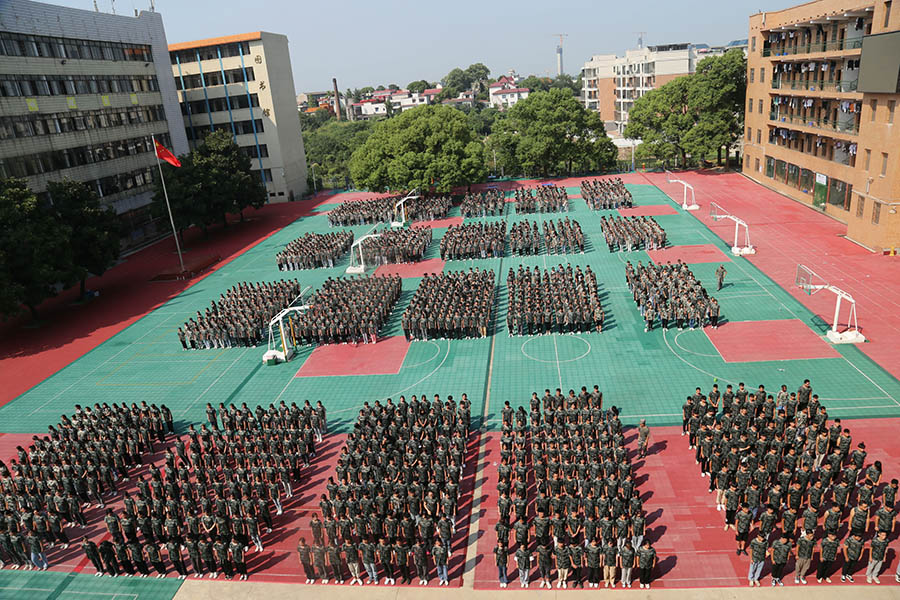在肃穆的奏国歌、升国旗仪式后,肖评校长检阅各方队,并宣布:“军训汇报表演正式开始。”之后10个连队喊着响亮的口号,排着整齐的队伍,以饱满的热情、抖擞的精神依次上场向全体师生汇报军训成果。