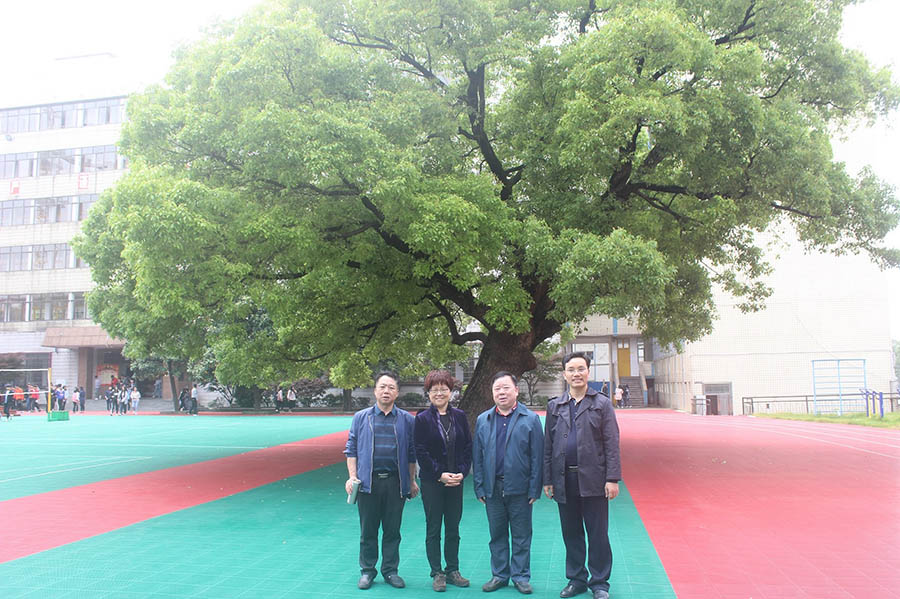 张炳生副厅长、熊小兰副局长一行在我校百年古树前合影留念