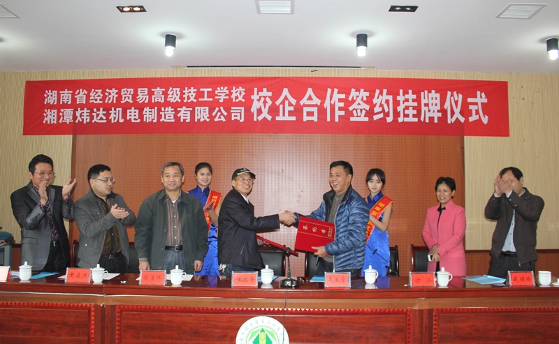 3月16日上午,湖南省经济贸易高级技工学校与炜达机电制造有限公司校企合作签约仪式在学术报告厅隆重举行,湘潭市教育局副县级干部、职成科科长郭萱怀,湘潭市人社局职业能力建设科科长方江,湘潭县科技局副局长黄启洪,湘潭天易示范区管委会发展部副部长盛瑾瑜,湘潭炜达机电制造有限公司董事长伍政华,湖南省经济贸易高级技工学校校长、党委书记吴玉章等出席签约揭牌仪式。
