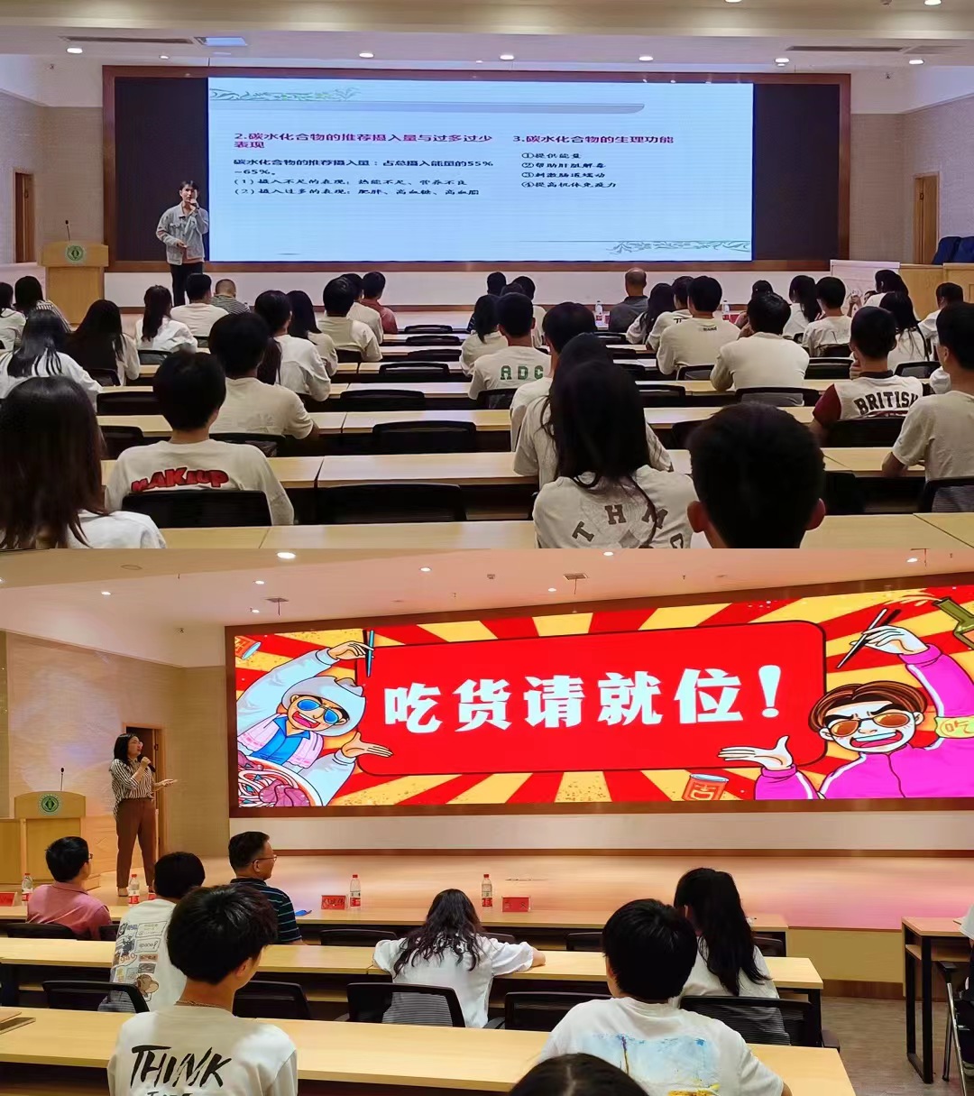 主讲刘蕾、廖奕扬老师从生活实例入手,运用开场舞、讲案例、短视频等方式给大家科普了常见的营养健康知识,并就同学们在日常生活中对健康饮食存在的疑问现场给予解答,气氛十分活跃。此次讲座过程中两位老师通过图文并茂、诙谐幽默的语言、多形式的互动使同学们感受到了讲座的乐趣,提高了同学们对食品营养与健康的认识,引导大家养成健康的饮食习惯。