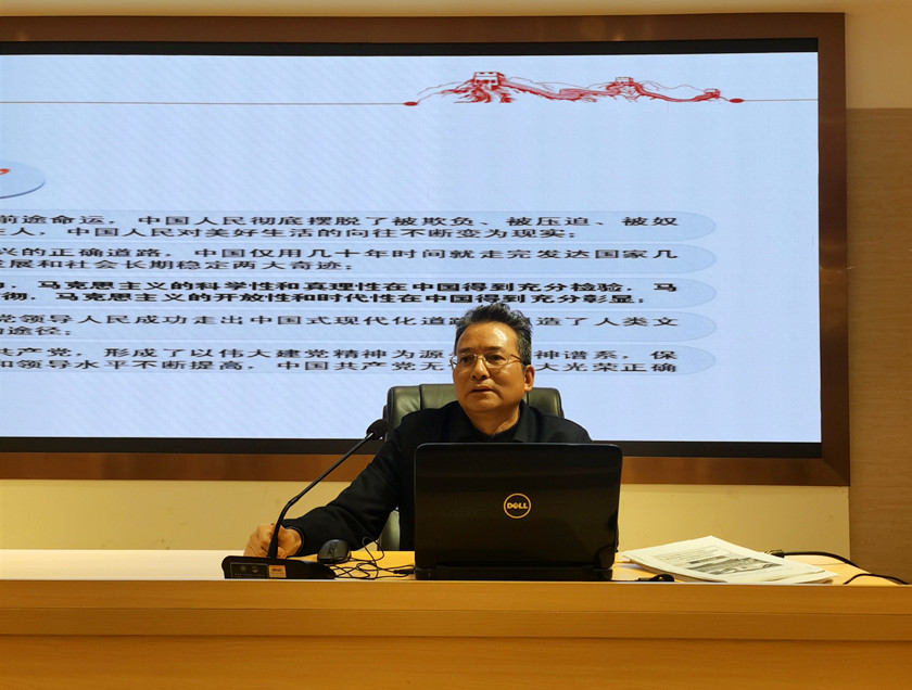 课上,刘建书记从党的十九届六中全会的主要内容、重大意义、学习启示及认真学习贯彻落实全会精神等方面全面解读了全会精神。他指出,党中央在建党百年之际召开十九届六中全会,全面总结党的百年奋斗重大成就和历史经验,是郑重的历史性、战略性决策,体现了我们党重视和善于运用历史规律的高度政治自觉,体现了我们党牢记初心使命、继往开来的自信和担当。准确理解党的十九届六中全会精神,要深刻把握“一个牢记”的根本问题,“两个确立”的决定性意义,“三次飞跃”的理论成果,“四个时期”的伟大成就,“五个方面”的历史意义,“十个坚持”的历史经验。全会一个重大成果是通过被称为第三个历史决议的《中共中央关于党的百年奋斗重大成就和历史经验的决议》,其重大而突出的理论贡献就是对习近平新时代中国特色社会主义思想进行新的阐述和概括,用“两个确立”郑重宣示全党全国人民的共同心愿,从而将党的创新理论的历史地位和政治定位推进一个新高度,是马克思主义中国化新的飞跃的重要里程碑,具有“极其重要的政治分量和历史分量”。全会必将为我们党团结带领全体人民实现第二个百年奋斗目标、实现中华民族伟大复兴注入澎湃动力!