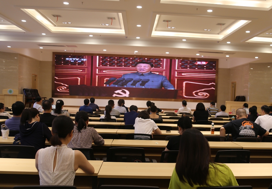 7月1日上午8时,庆祝中国共产党成立100周年大会在北京天安门广场隆重举行。中共中央总书记、国家主席、中央军委主席习近平出席大会并发表重要讲话。全教教职工在粮油综合实训大楼三楼会议室集中收看网络直播,共庆中国共产党百年华诞。