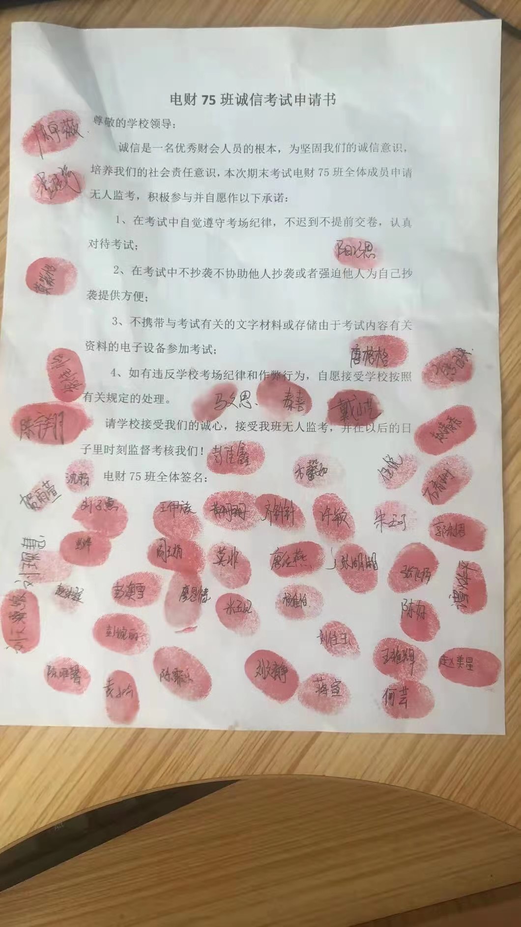 临近期末,学校教务科收到了一份“特殊”的申请书,电财75班的51位同学盖上红手印,申请期末考试为诚信考试,不需要老师来监考。教务科收到申请书后,对电财75班全体学生提出的申请表示高度赞同,并对该班诚信考试进行了工作安排和部署。
