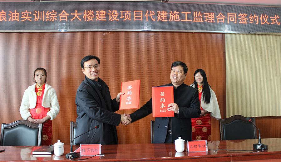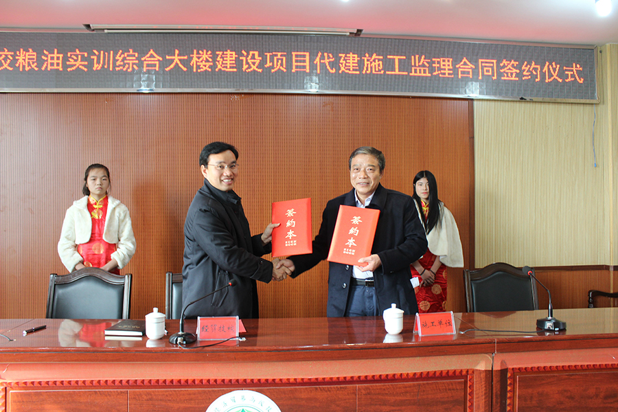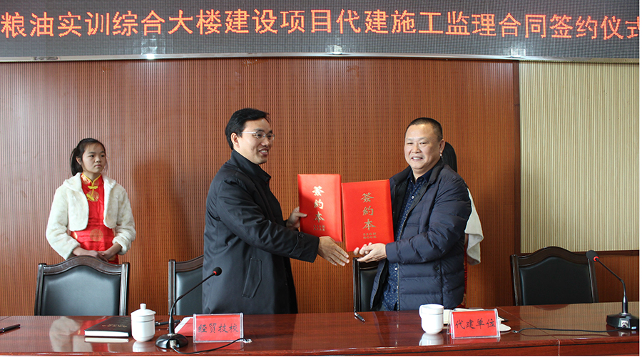 12月21日上午,我校粮油实训综合大楼建设项目代建施工监理合同签约仪式在实训楼3楼学术报告厅举行。出席仪式的有校长兰录平、党委书记肖评、正处级督学、副校长李寿辉、纪委书记刘建伟、工会主席彭德生、湖南天鉴工程项目管理有限公司项目经理张嘉敏、湖南顺天建设集团有限公司湘潭片区负责人谭林泉、湖南湘安民防工程建设监理咨询有限公司法人代表李斌等。