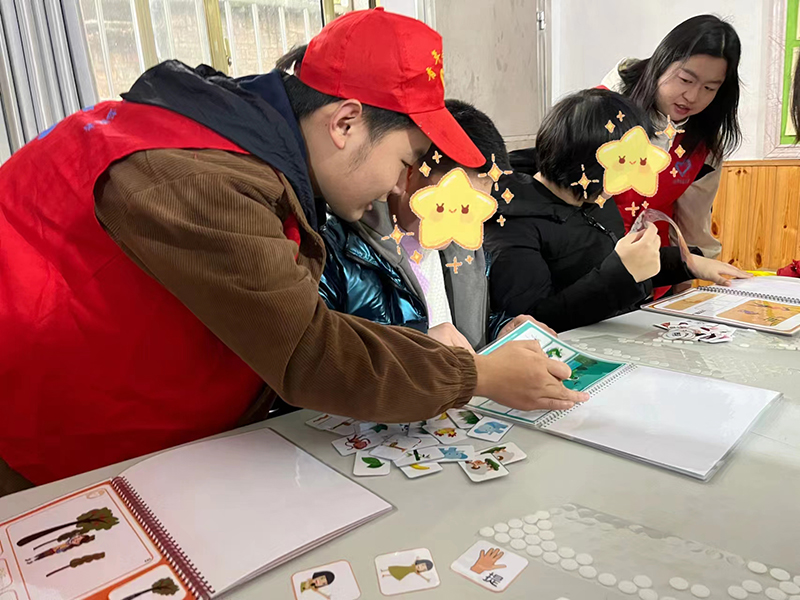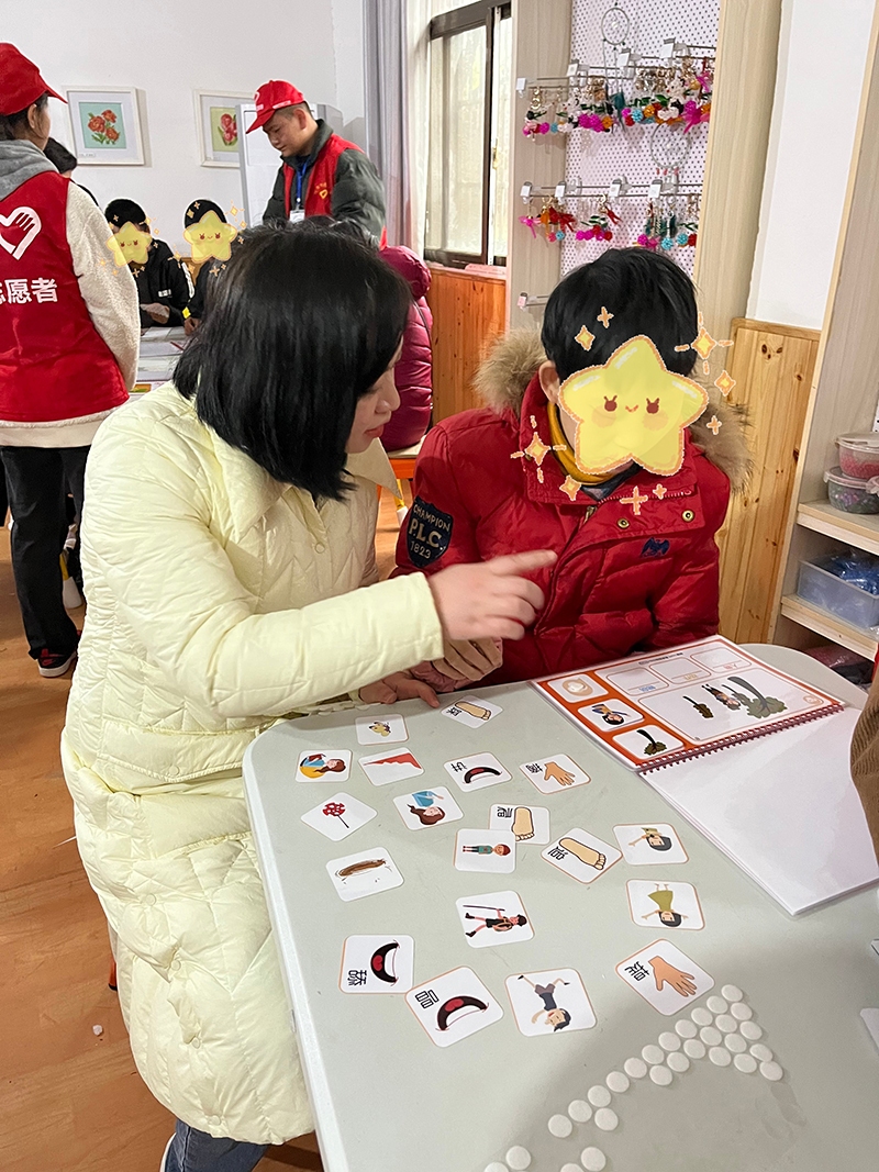 志愿者们像朋友一样陪他们一起学习,一起训练。在制作手工书本的过程中,他们有的无法将书帖贴在正确的位置,有的无法将书本的图文进行正确的配对。但在志愿者们耐心地引导下,他们能迅速改正。志愿者们看着他们的进步,为他们感到自豪。