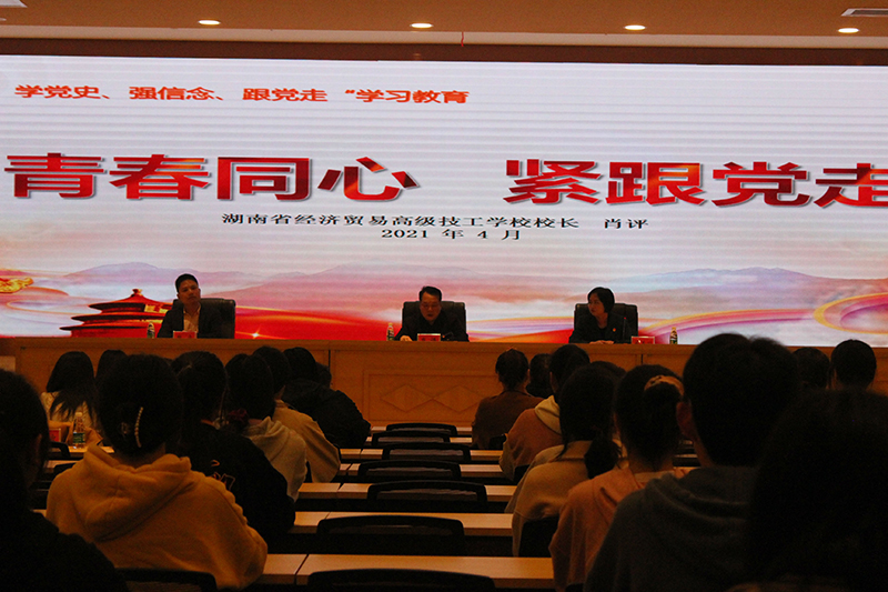 为庆祝党的百年华诞,激发学校团员青年爱党、爱国、爱社会主义的热情,大力推进“学党史、强信念、跟党走”党史学习教育,4月28日,湖南省经济贸易高级技工学校党委委员、校长肖评给师生上了一堂题为“青春同心 紧跟党走”的主题团课。学校部分青年教师及200多名团员共同聆听了此次团课。