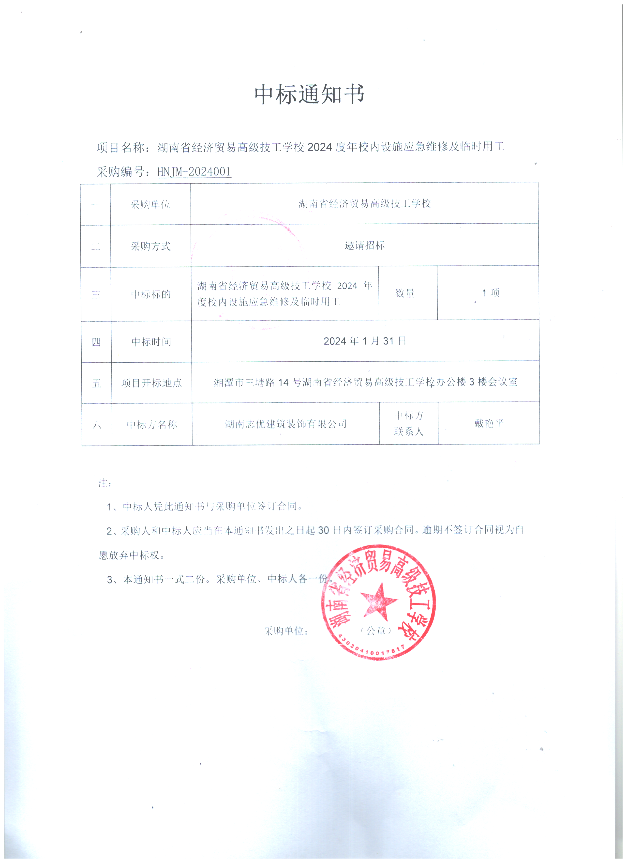 2024年度校内设施应急维修及临时用工项目中标通知书