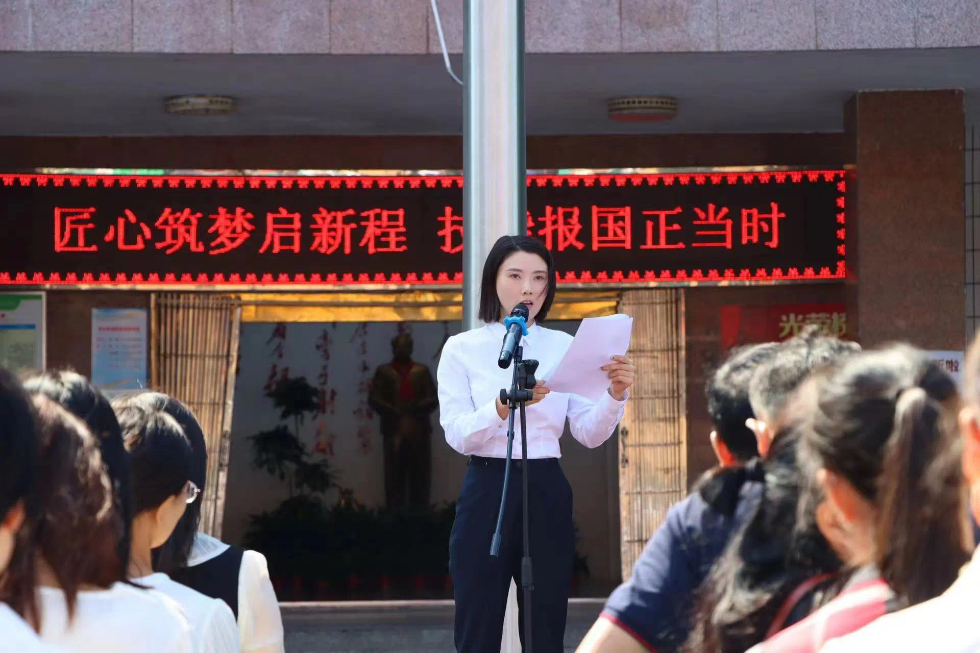 在全体师生的注视下,国旗仪仗队迈着整齐划一的脚步走向升旗台。随着国歌奏响,鲜艳的五星红旗在阳光照耀下冉冉升起。全体师生面向国旗行注目礼,心中充满对祖国的热爱和对新学期的憧憬。