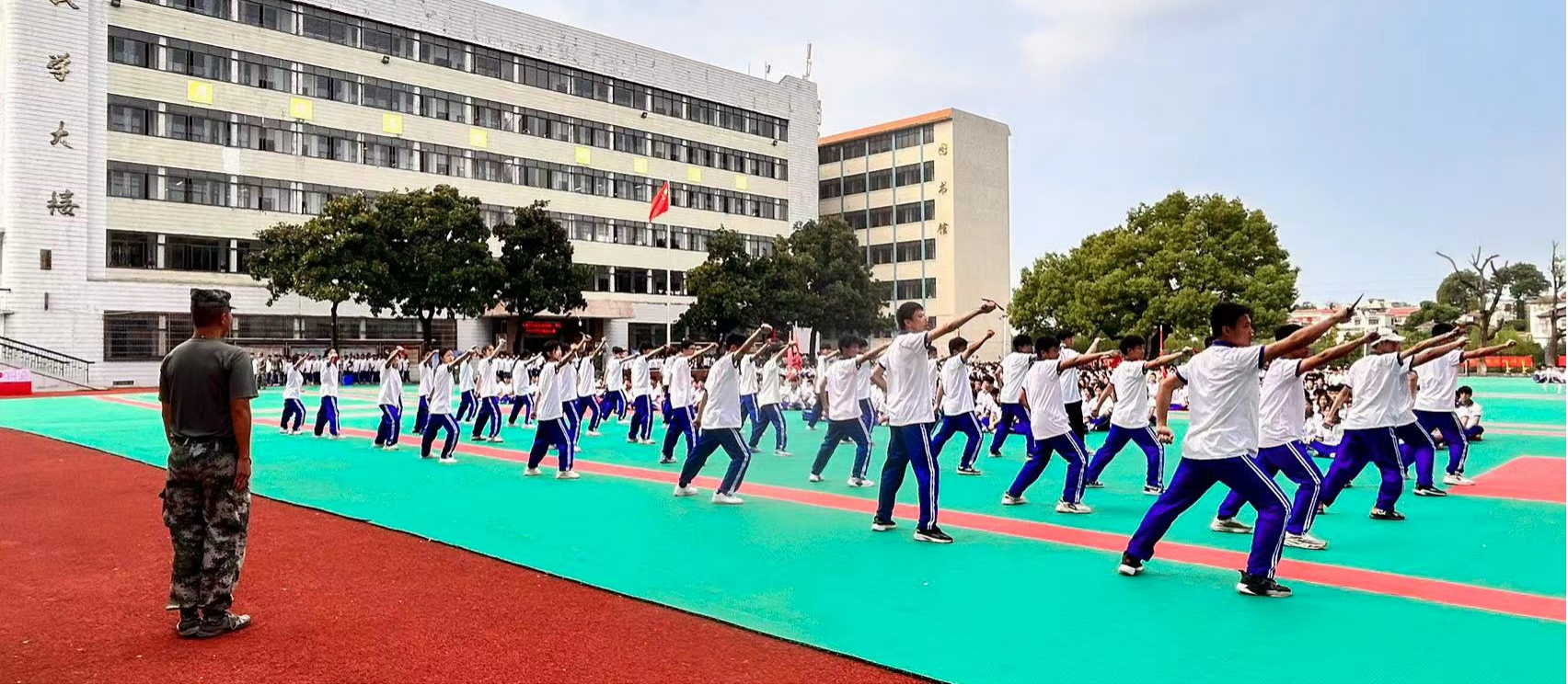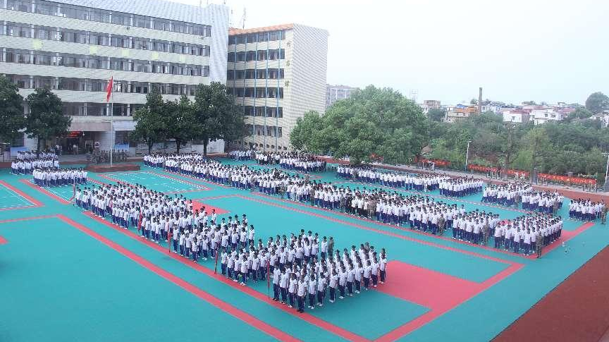 随后,童校长宣布“2024级新生军训会操正式开始”。一声令下,500余名新生代表“崇德尚技,明理自强”的口号响彻校园,通过变换10秒倒计时队形表演,拉开了2024军训会操帷幕,向全校师生展示出了新一代青少年携手共进、勇往直前的精神面貌。