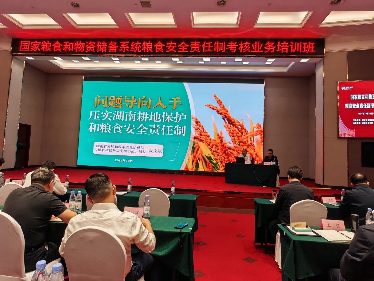 2024年10月15日至17日,国家粮食和物资储备局在郑州召开国家粮食和物资储备系统粮食安全责任制考核业务培训会。湖南作为全国13个粮食主产省之一,始终牢记习近平总书记的谆谆教诲,坚决扛起维护国家粮食安全的重任,落实耕地保护和粮食安全责任制工作取得了较好成效,在全国落实耕地保护和粮食安全责任制考核中获评优秀省份。湖南省发展改革委党组成员,省粮食和物资储备局党组书记、局长夏文斌以《问题导向入手压实湖南耕地保护和粮食安全责任制》为题在会上作专题典型经验介绍授课。