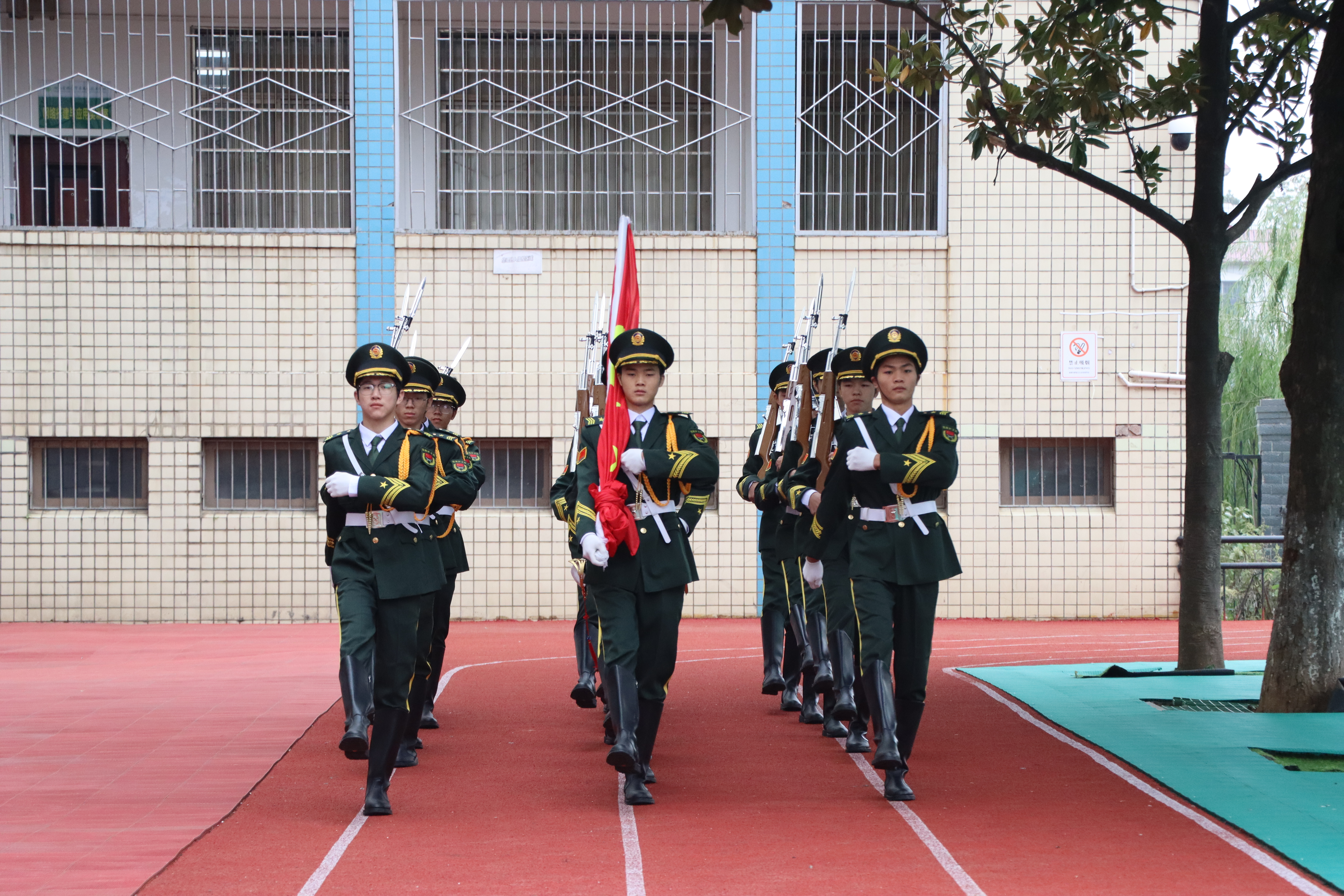 国旗仪仗队迈着整齐划一的步伐走向升旗台。在雄壮的国歌声中,鲜艳的五星红旗冉冉升起,迎风飘扬,全体师生行注目礼。