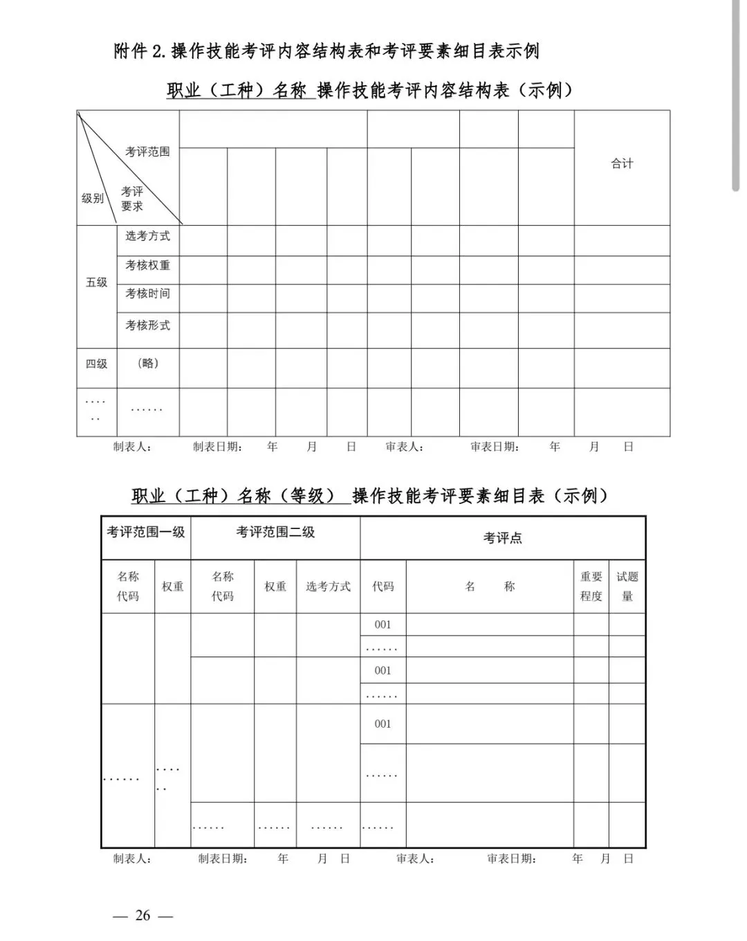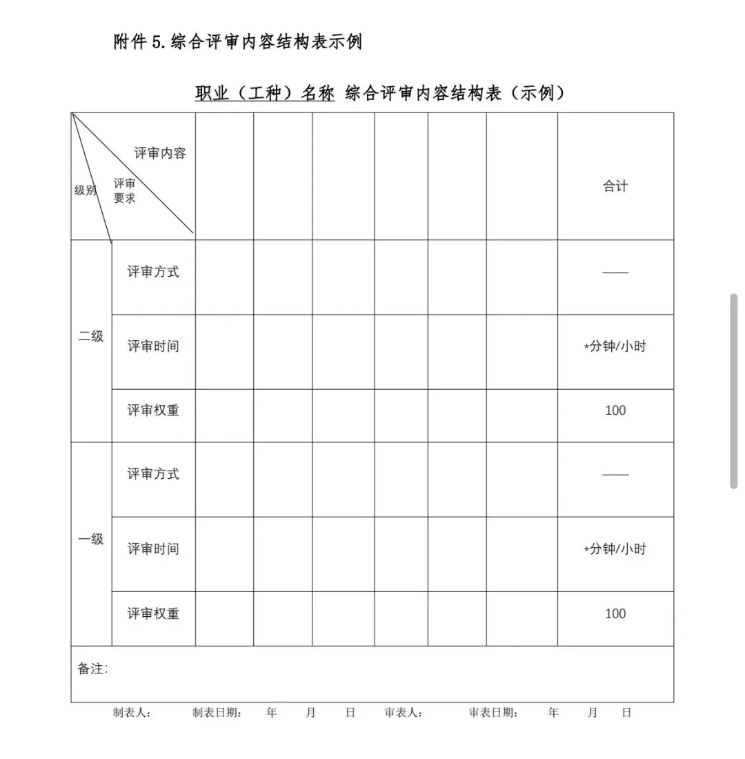 编制考评蓝图时,应依据职业标准和命题说明,结合本职业(工种)生产活动实际,合理确定理论知识考试、操作技能考核、职业素养评定、工作业绩评审以及综合评审的考评要素(要点),明确相应考评方式、题型题量、作答时间、权重比例等。理论知识试卷结构表和考评要素细目表、操作技能考评内容结构表和考评要素细目表、职业素养评定量表、工作业绩评审量表、综合评审内容结构表的相应示例分别见附件1、2、3、4、5。