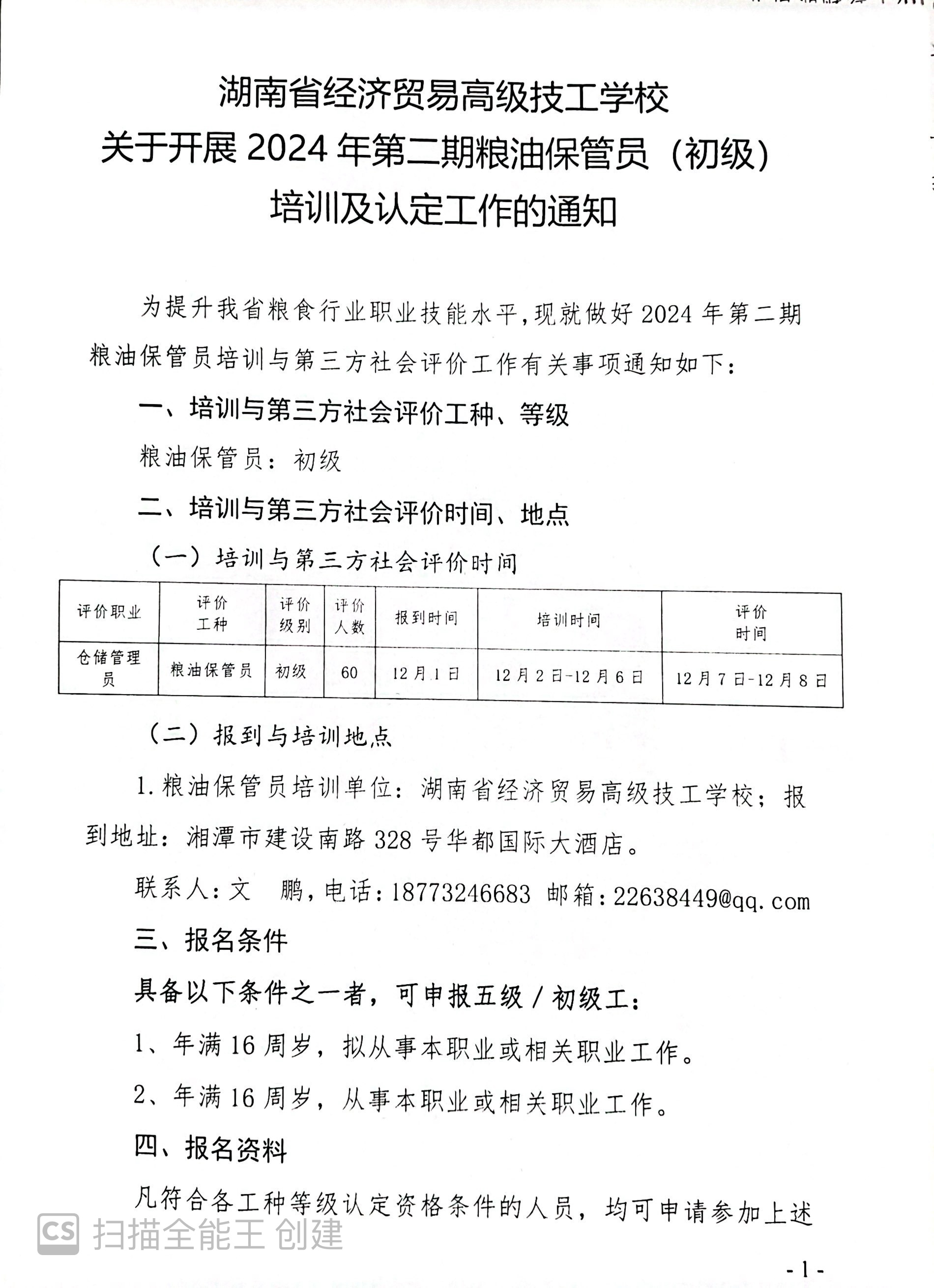 关于开展2024年第二期粮油保管员(初级)培训及认定工作的通知
