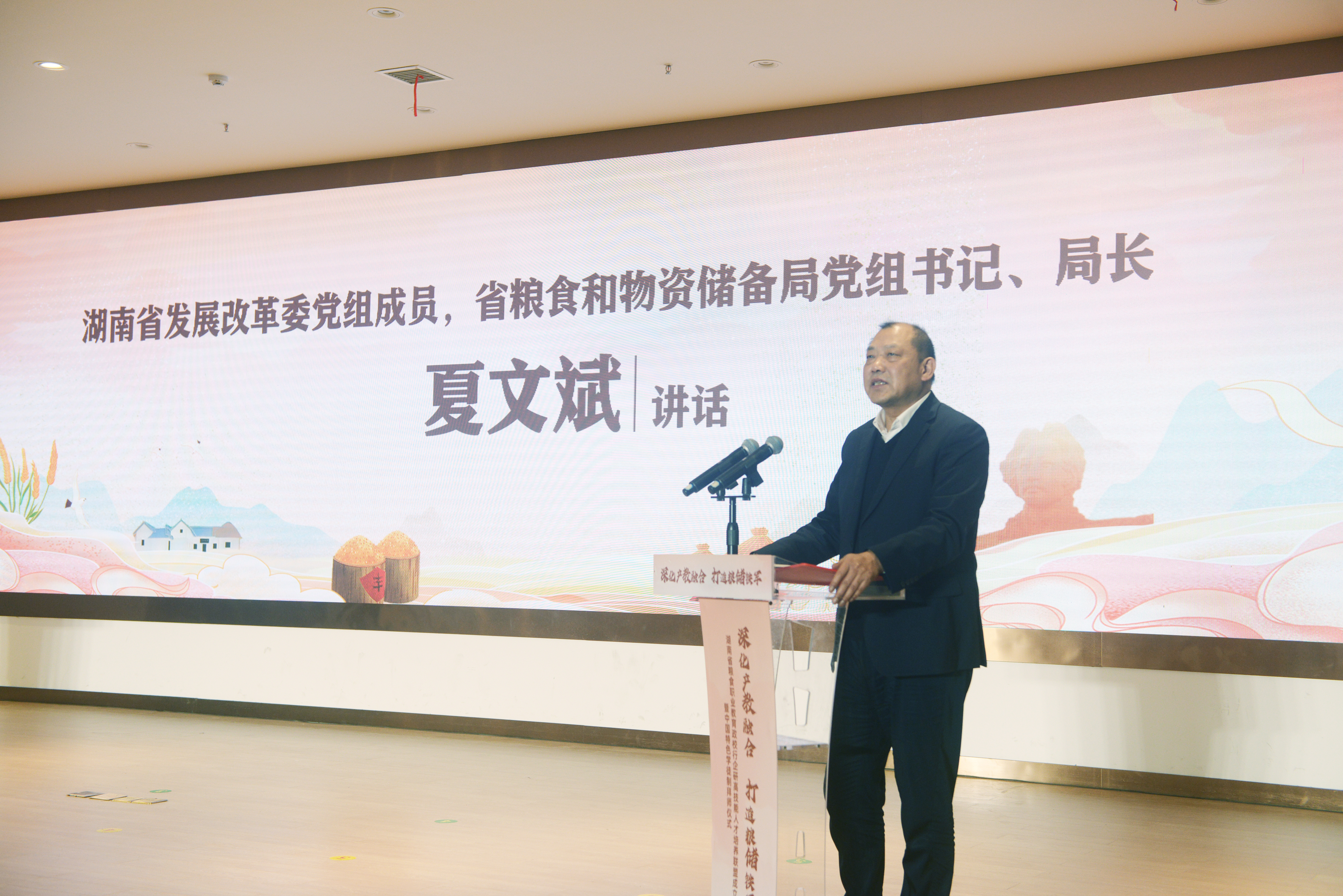 12月17日,冬日的阳光温暖而又清新,校园流光溢彩,气氛热烈,高朋满座,处处洋溢着喜庆氛围,全省粮食职业教育政校行企研高技能人才培养联盟暨中国特色学徒制拜师仪式大会在我校多功能厅隆重举行。出席会议的有省发展改革委党组成员,省粮食和物资储备局党组书记、局长夏文斌,省农业发展投资集团党委书记、董事长龚小波,省农业发展投资集团党委副书记、职工董事陈建伟,省粮食行业学会会长石少龙,省局相关处室领导,湘潭市发改委、人社局、教育局等相关部门领导,湖南农业大学、中南林业科技大学等高校专家,以及省储备粮公司、中粮米业(岳阳)分公司、市粮食储备中心等全省粮食企业代表和省、市粮油产品质量监测中心等科研机构代表。学校班子成员、粮食专业师生代表参加了此次大会。会议由省粮食和物资储备局党组成员、副局长肖江龙主持。