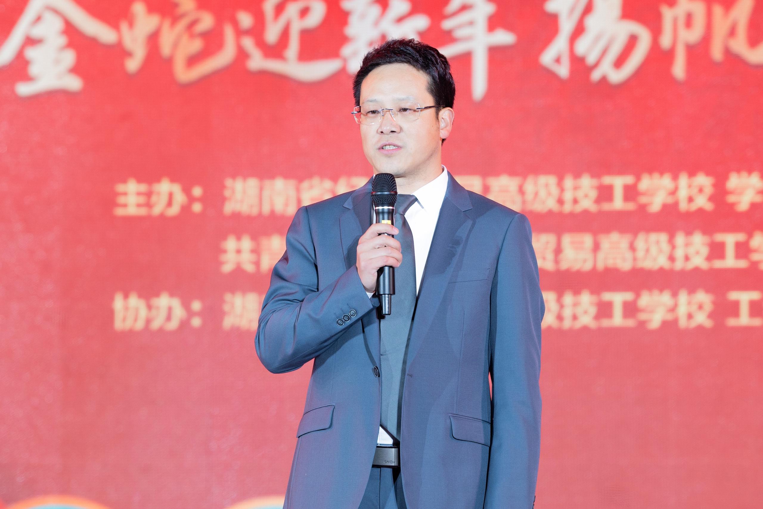 童国平校长代表学校向长期以来关心支持学校发展的各级领导、家长、退休干部及全体师生表示衷心的感谢和诚挚的问候。他指出,回首往昔,全校师生同心协力,招生就业两旺,规范化管理再上新台阶;在湘潭市职业技能竞赛中荣获团体第一名,58人次摘得省级桂冠,5人次荣获国家级殊荣;学校“三下基层”社会实践服务队深入全省14个地市州,充分展现了省经贸学子的风采,为打造粮食强省、推动乡村振兴、服务“三高四新”战略贡献了经贸力量。展望未来,学校将出台一系列措施为成就学生出彩人生奠定坚实的基础。
