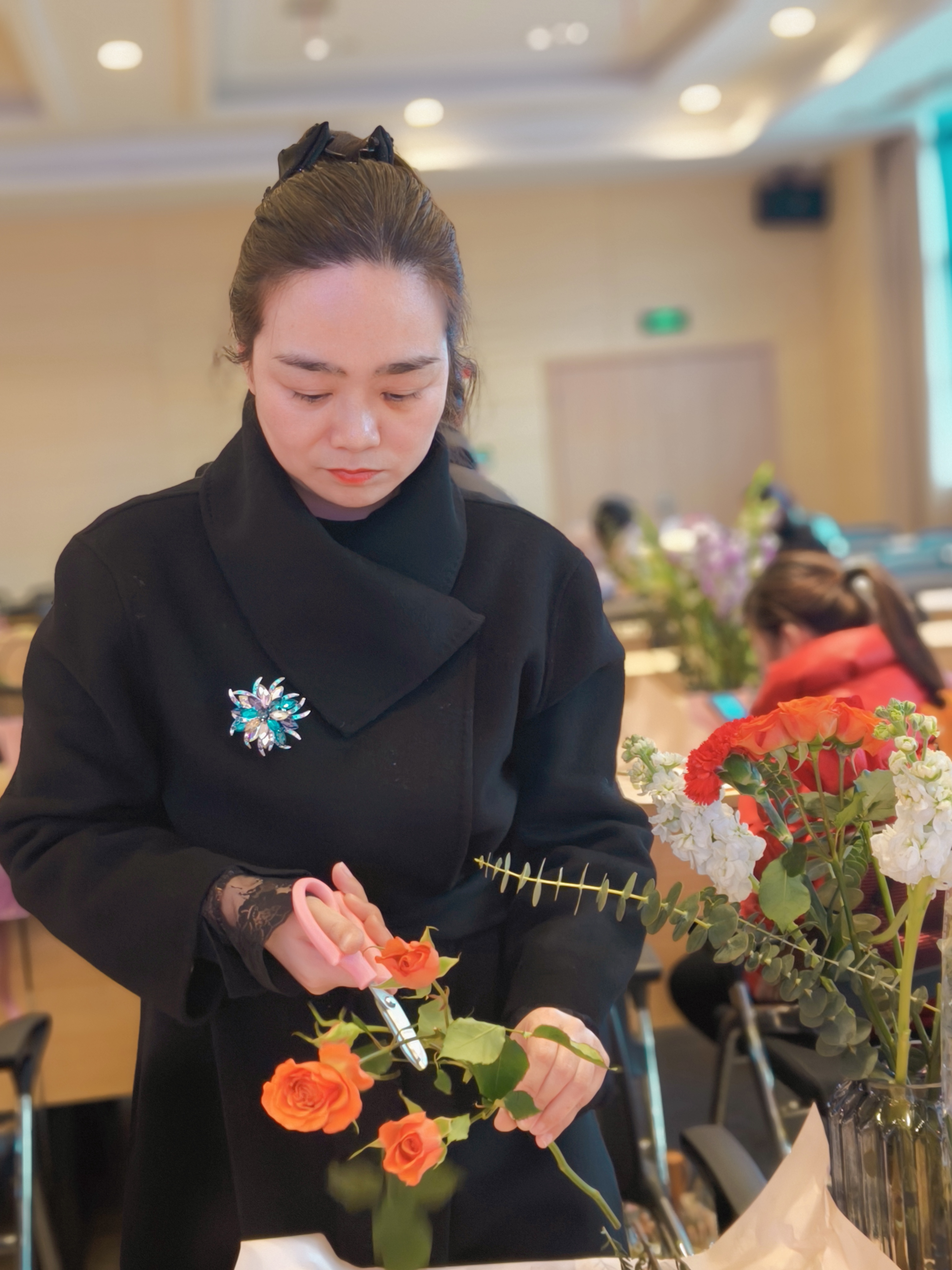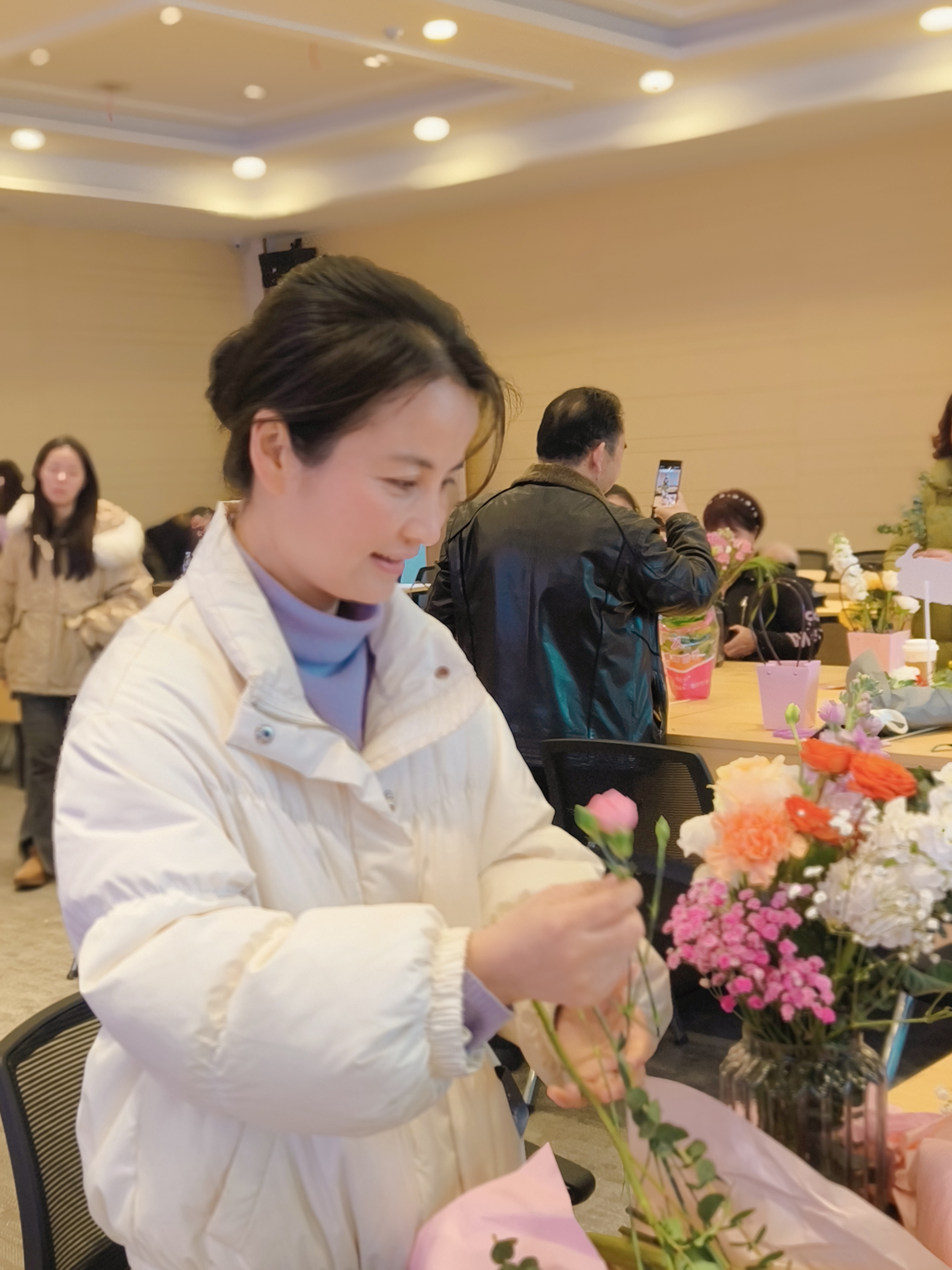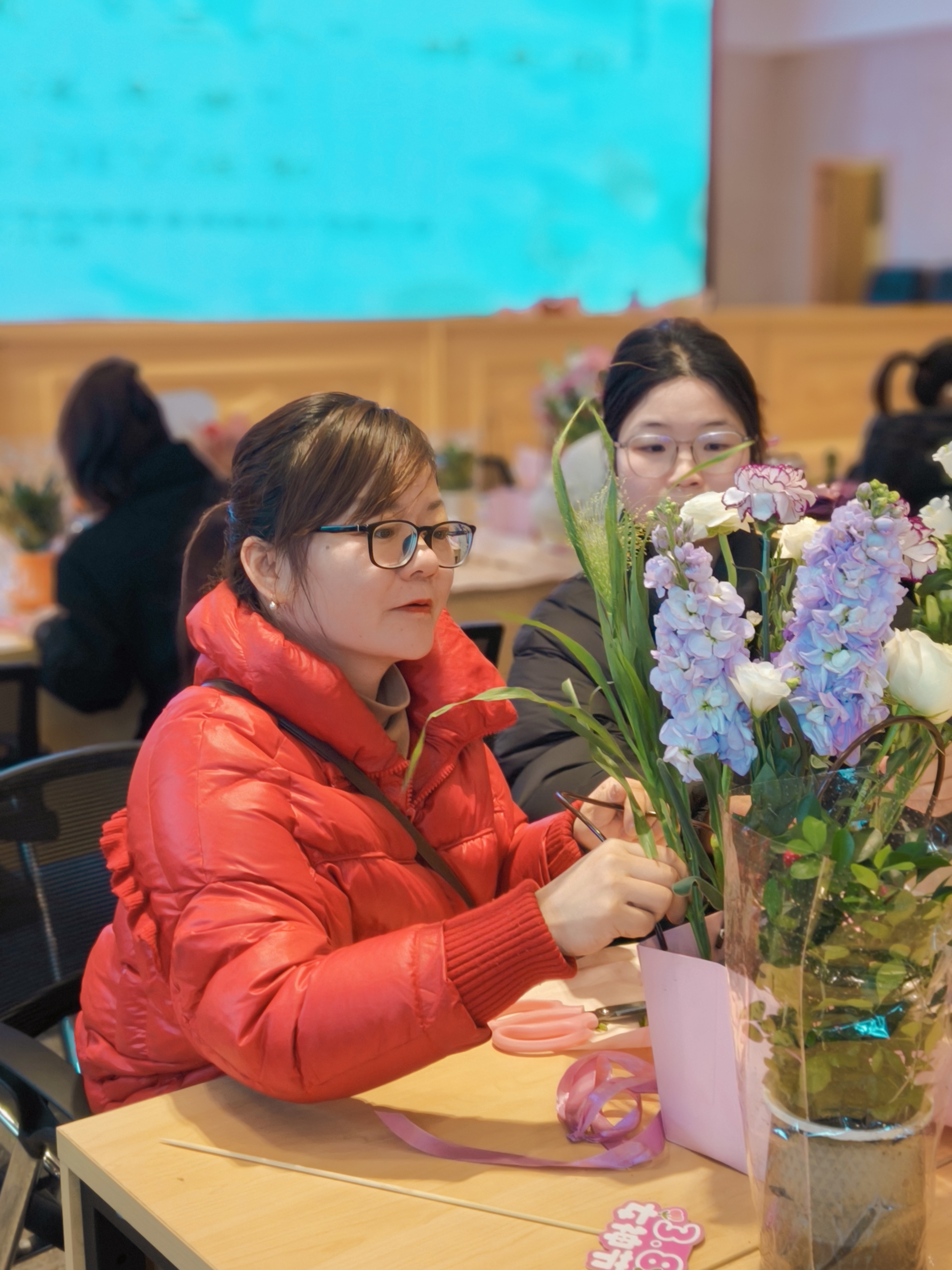 上午,插花活动在学校多功能厅拉开帷幕。现场花团锦簇,玫瑰、百合、康乃馨等各类鲜花娇艳欲滴。专业花艺师细致讲解插花技巧,从花材选择、色彩搭配到造型设计,女教职工们认真聆听,不时提问。在动手环节,大家充分发挥创造力,修剪花枝、搭配造型,原本零散的花材在一双双巧手下,变成了精美绝伦的插花作品。活动现场欢声笑语不断,大家互相欣赏、交流心得,沉浸在插花带来的乐趣中。