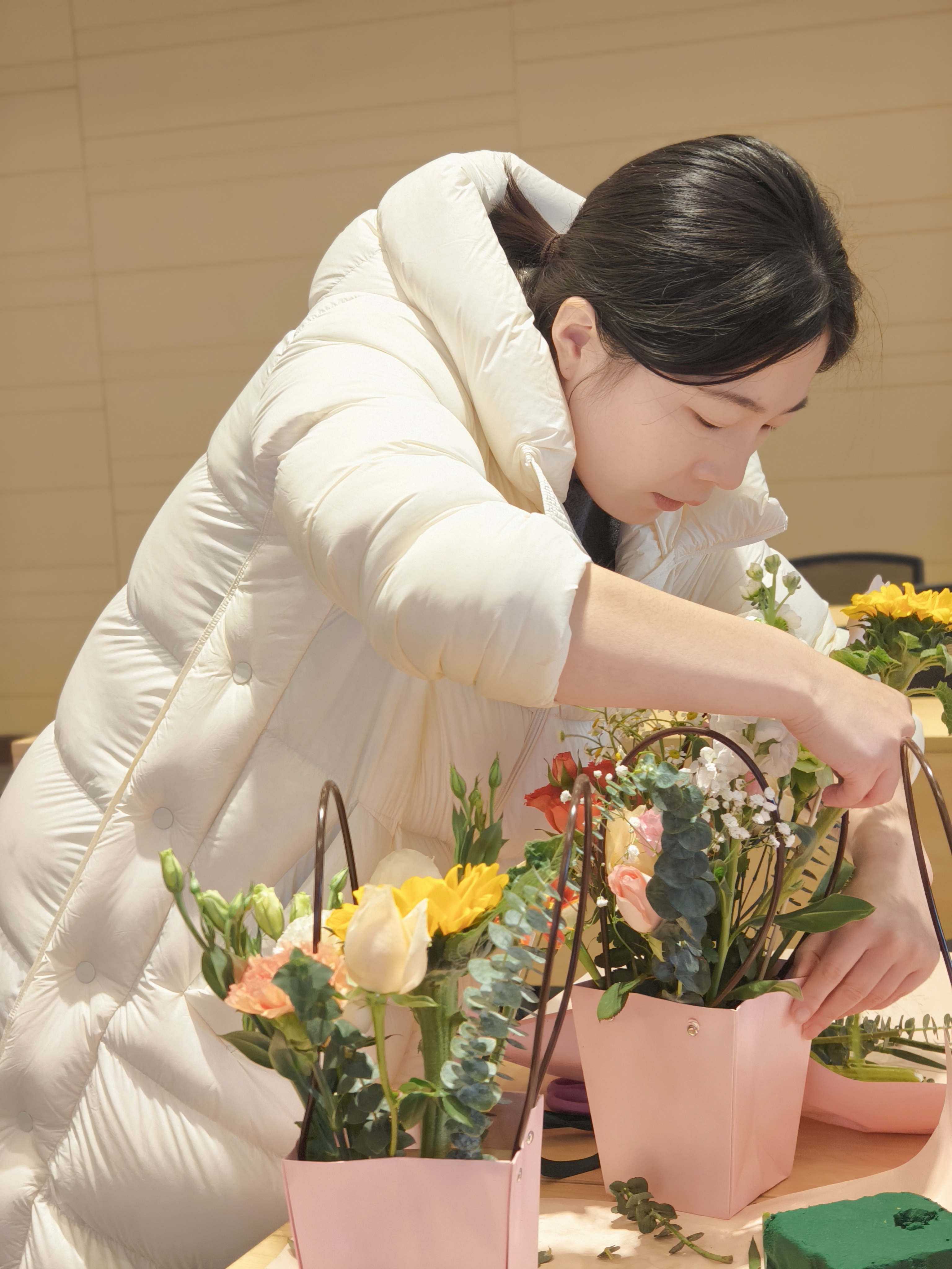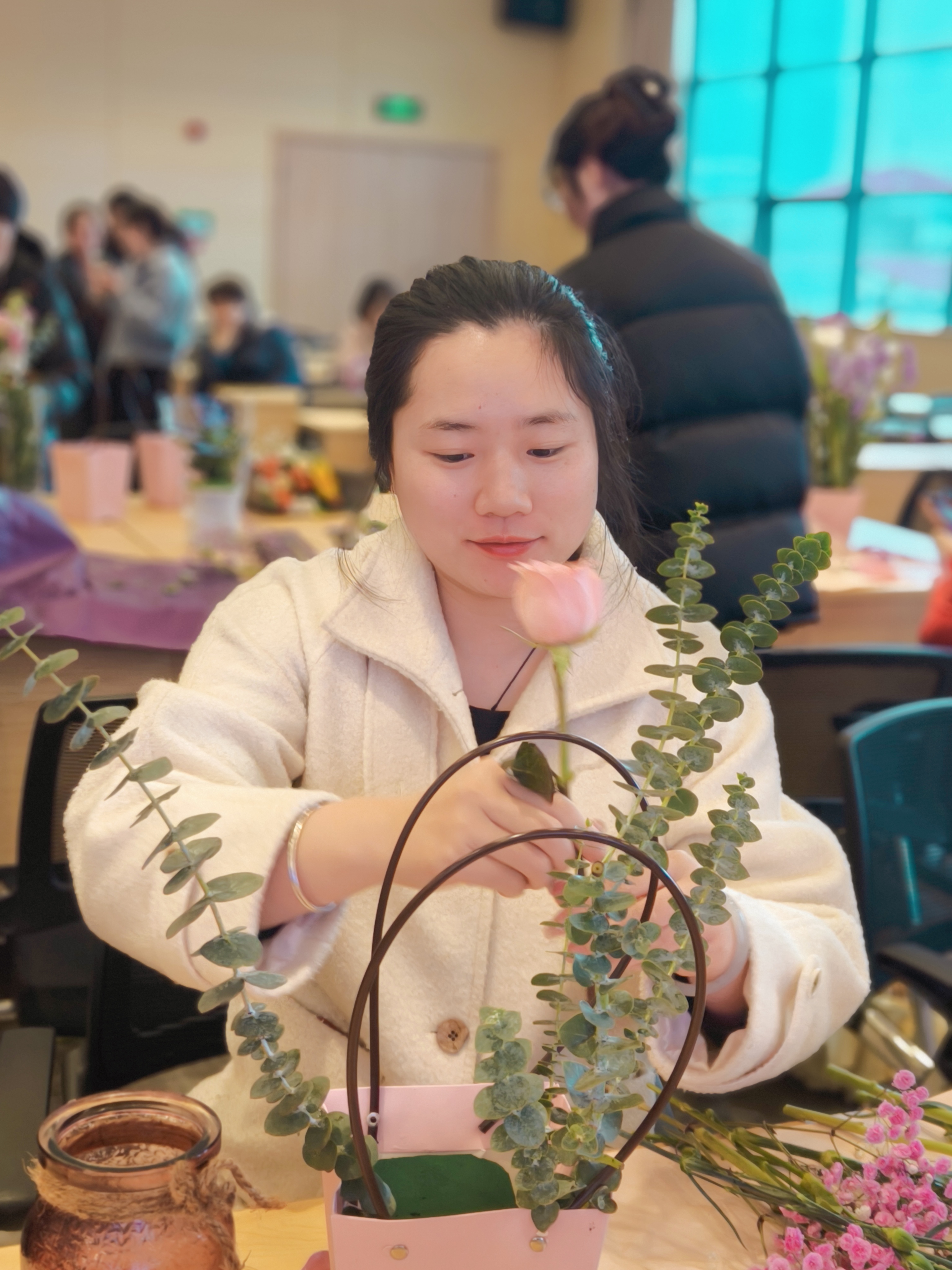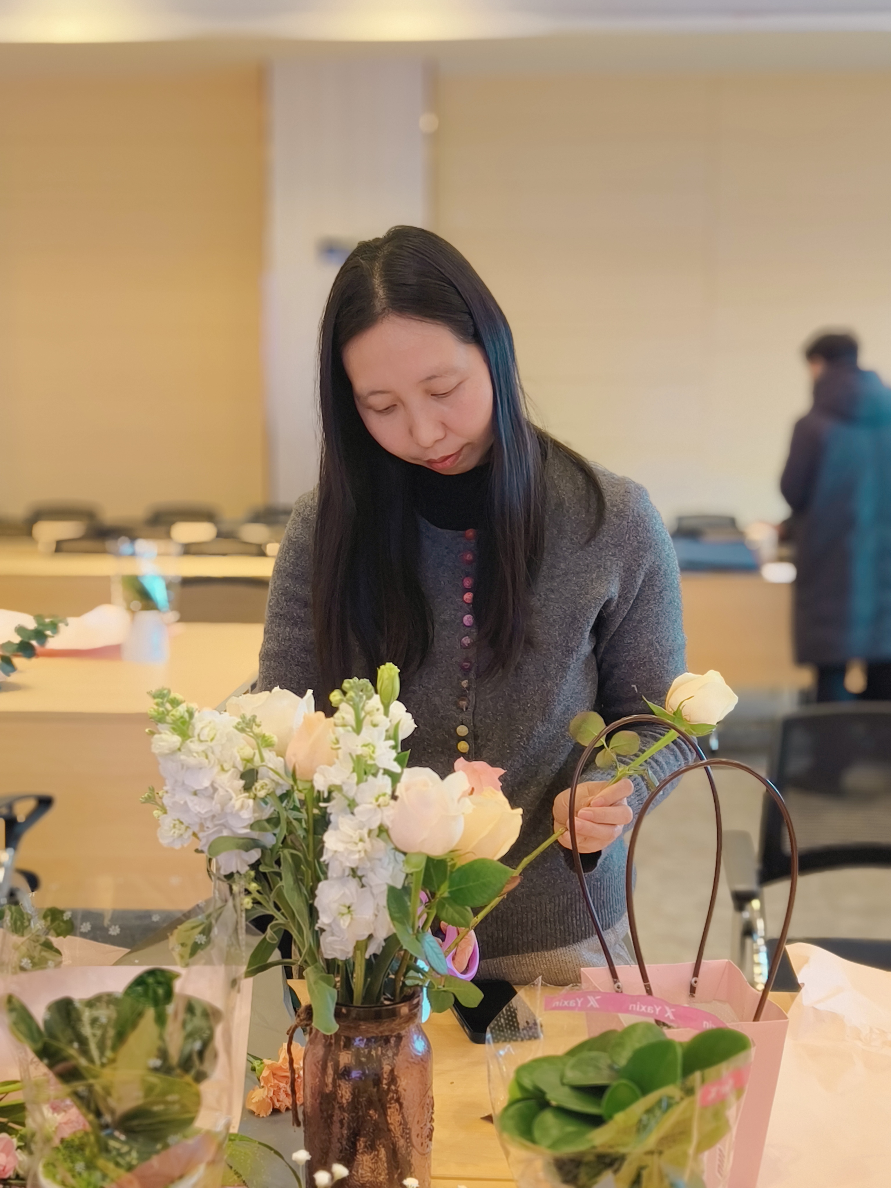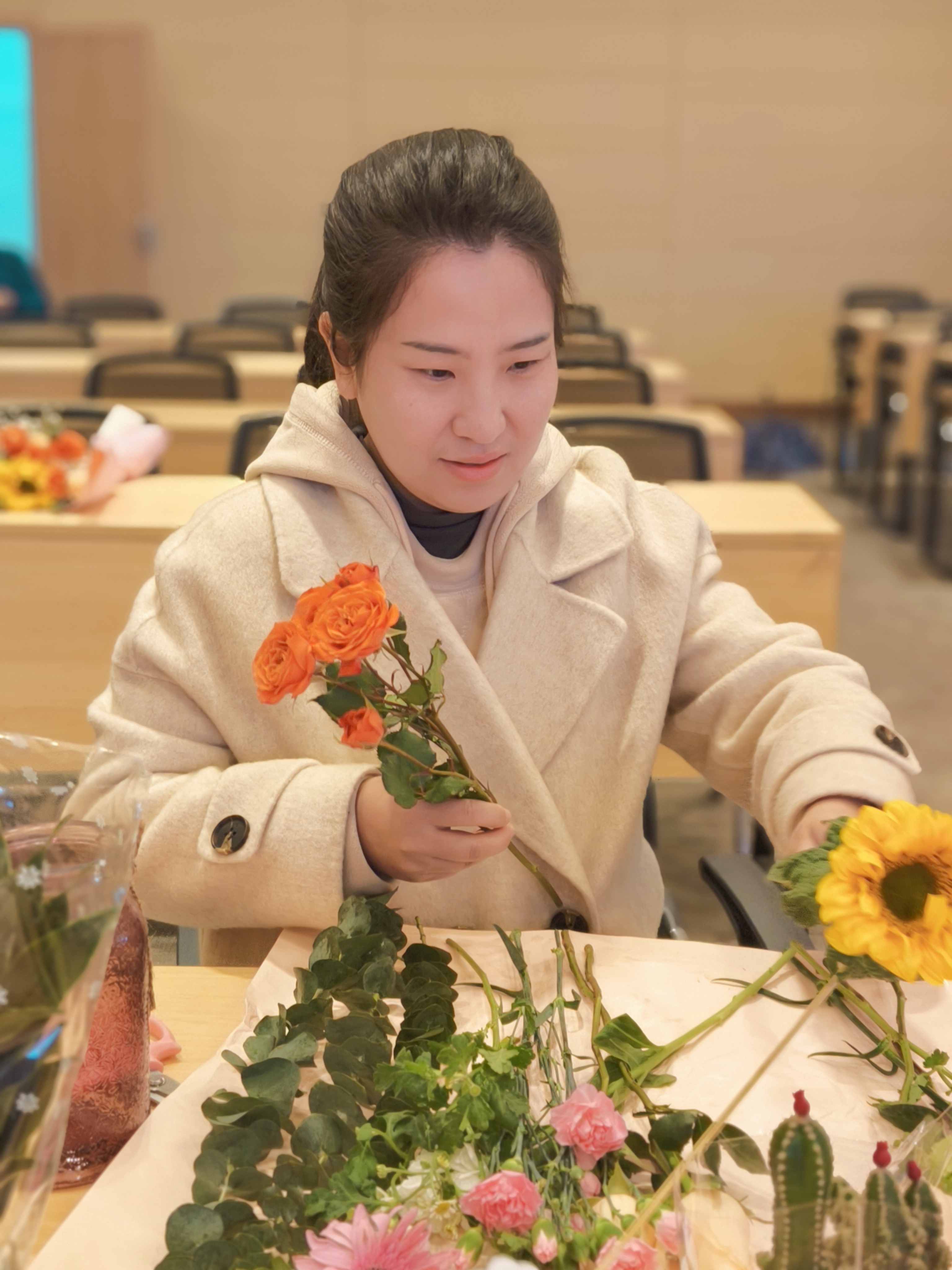 上午,插花活动在学校多功能厅拉开帷幕。现场花团锦簇,玫瑰、百合、康乃馨等各类鲜花娇艳欲滴。专业花艺师细致讲解插花技巧,从花材选择、色彩搭配到造型设计,女教职工们认真聆听,不时提问。在动手环节,大家充分发挥创造力,修剪花枝、搭配造型,原本零散的花材在一双双巧手下,变成了精美绝伦的插花作品。活动现场欢声笑语不断,大家互相欣赏、交流心得,沉浸在插花带来的乐趣中。