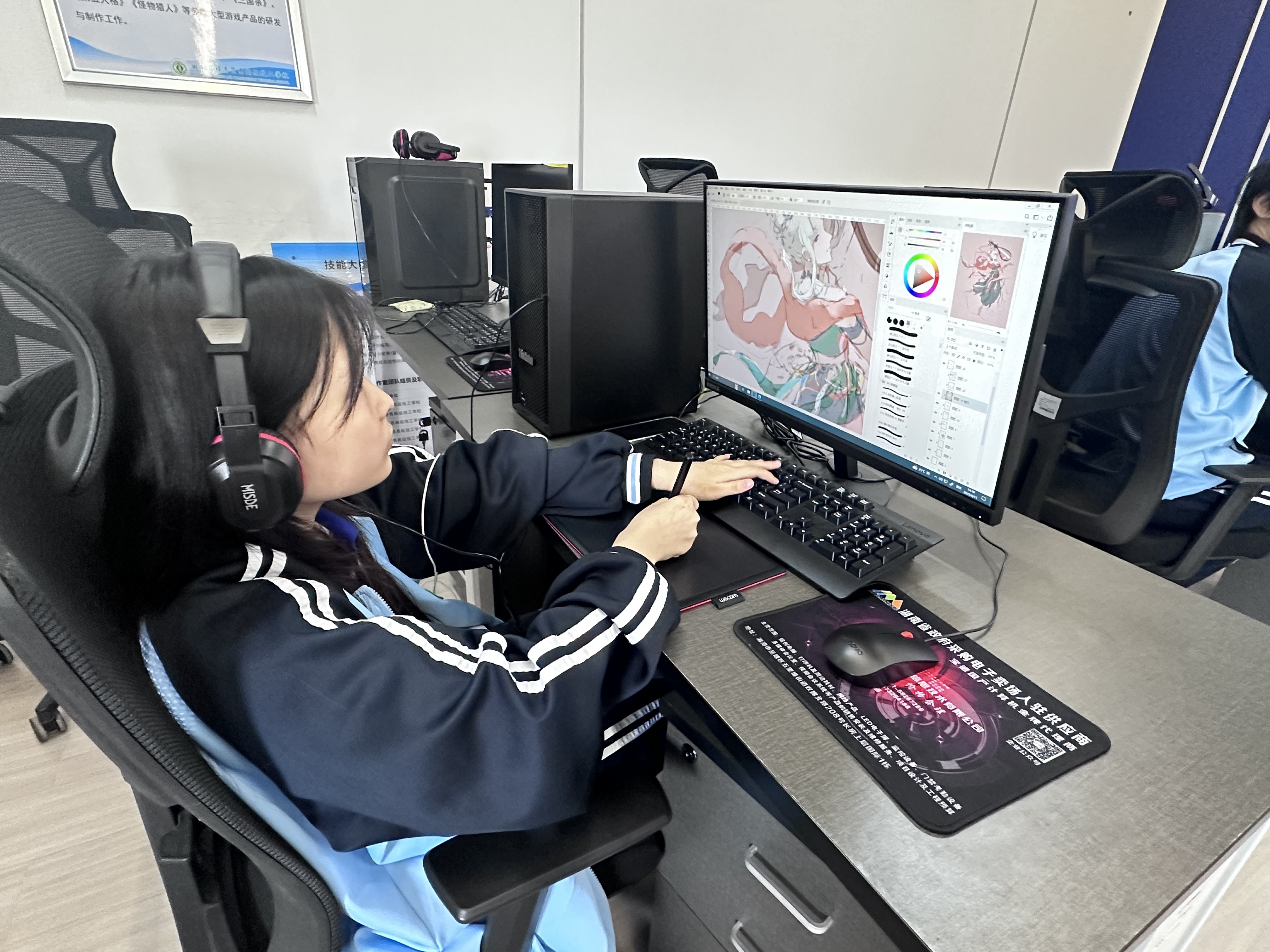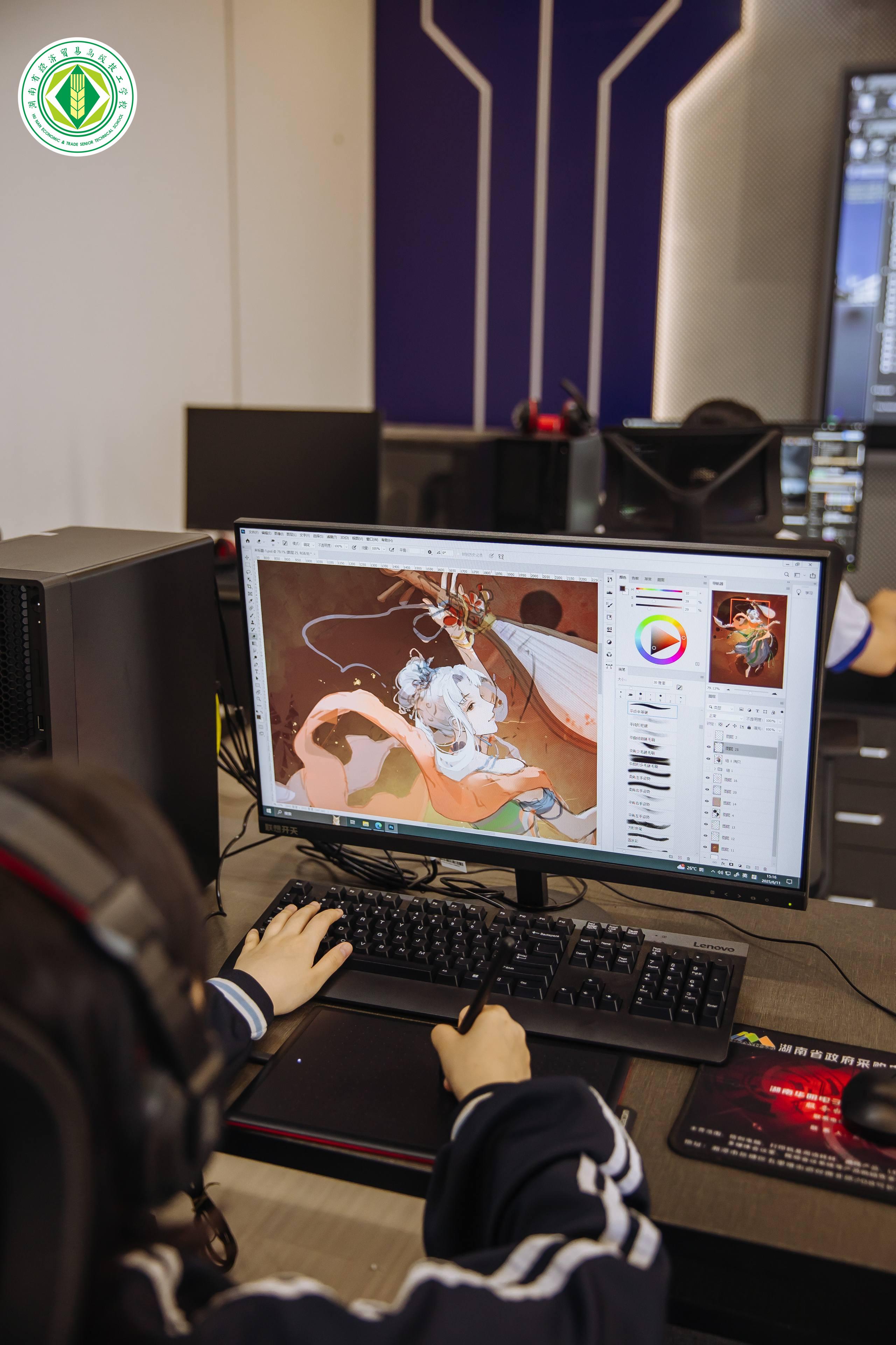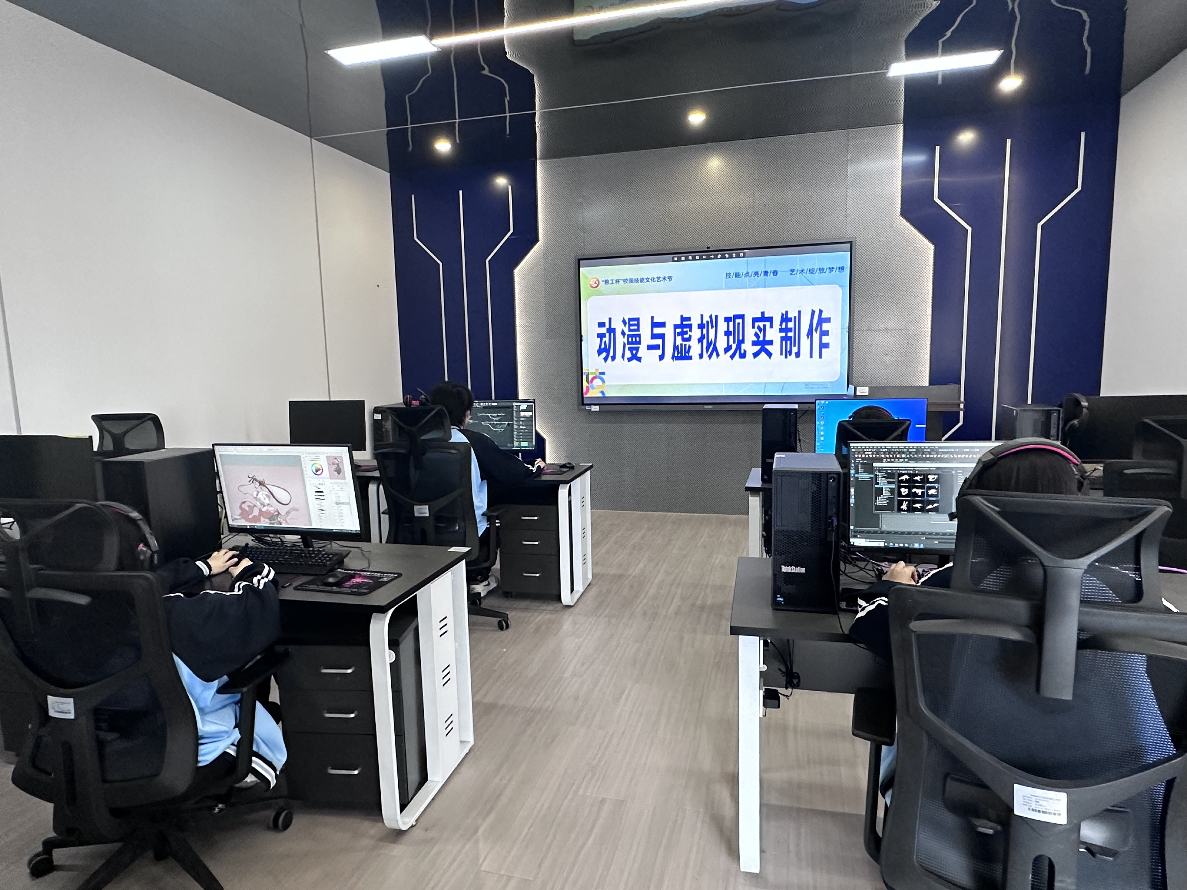 在动漫与虚拟显示制作展示环节,3名学生协作呈现数字创意全流程。一名学生专注数字绘画进行角色设计,完成后由同伴进行精细的角色建模,最终由第三位学生实现虚拟现实交互体验。技术应用娴熟流畅,一气呵成,“创意孵化+技术实现”的硬核实力尽显无遗。