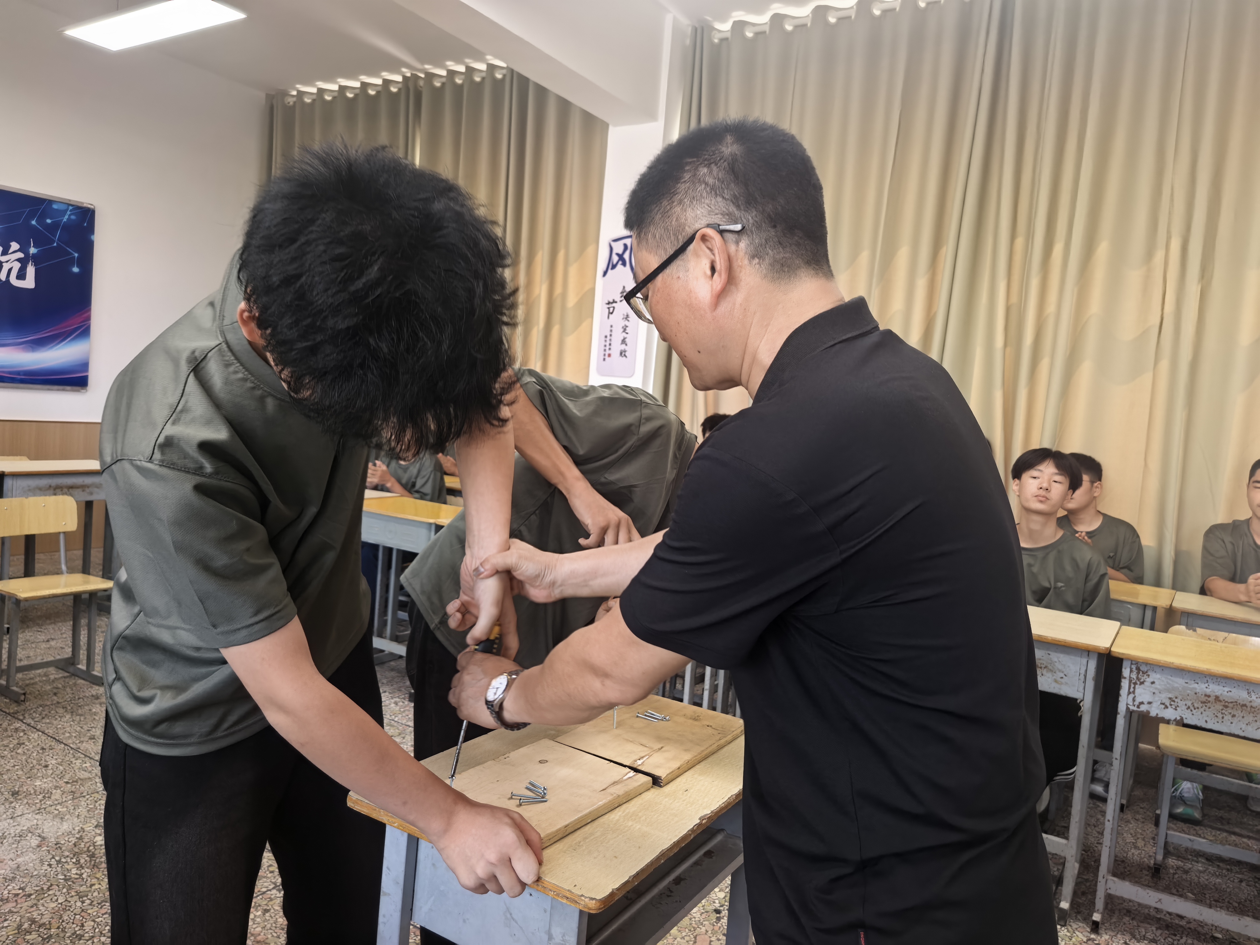 随后,伍志明大师走进数控61班参加主题班会交流活动。活动现场,他与同学们面对面交流,耐心解答大家关于技能提升、职业规划等方面的疑问。同时作为评委参与“螺钉精准拧入赛”活动,周大师亲手指导,学生现场兴趣高昂,最终优胜者获得“伍大师签名限量明信片”将现场气氛推向最高潮。从认识大师到走进大师到学习大师,同学们纷纷表示,要以劳模工匠为榜样,坚定技能报国信念,不负韶华,砥砺前行。