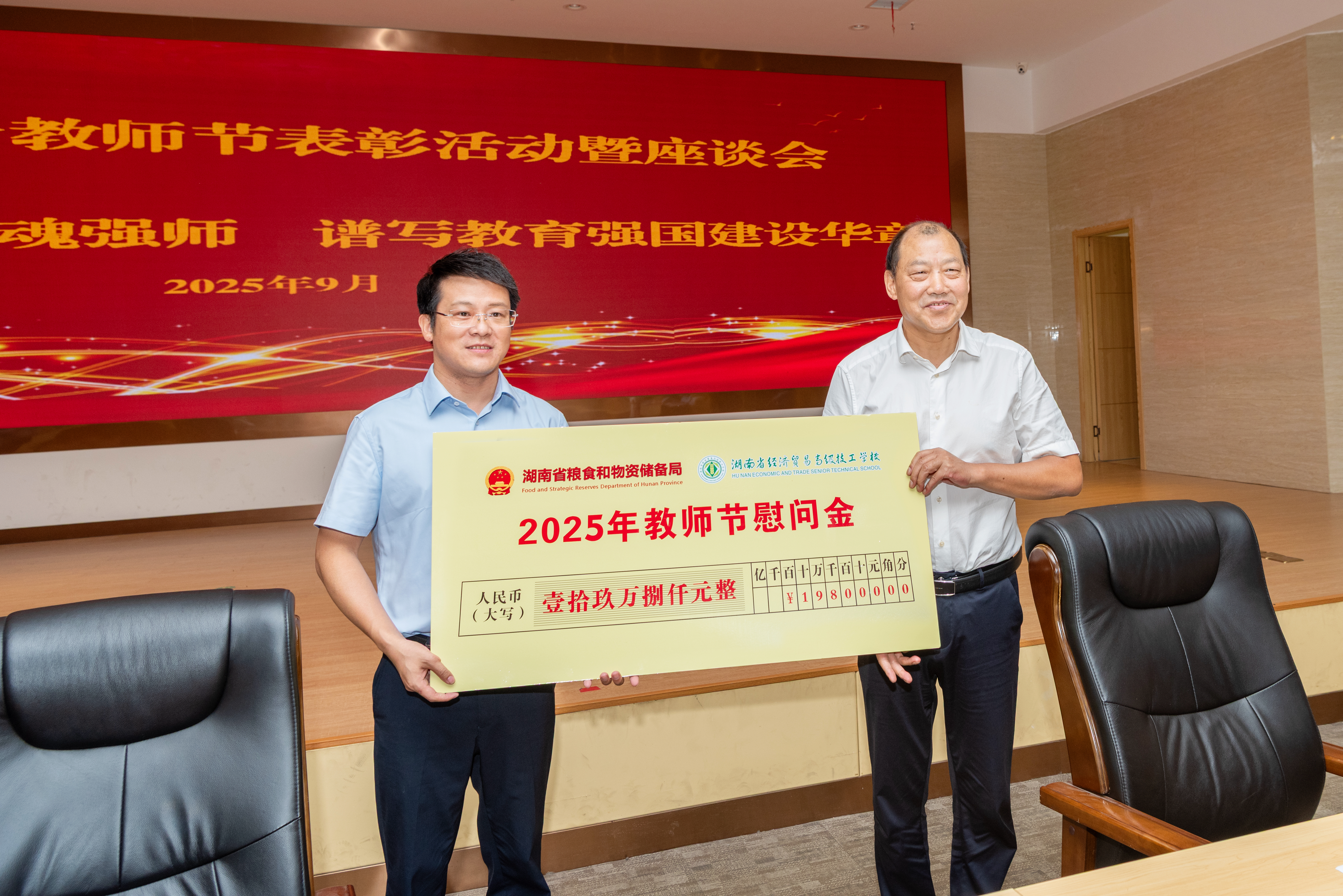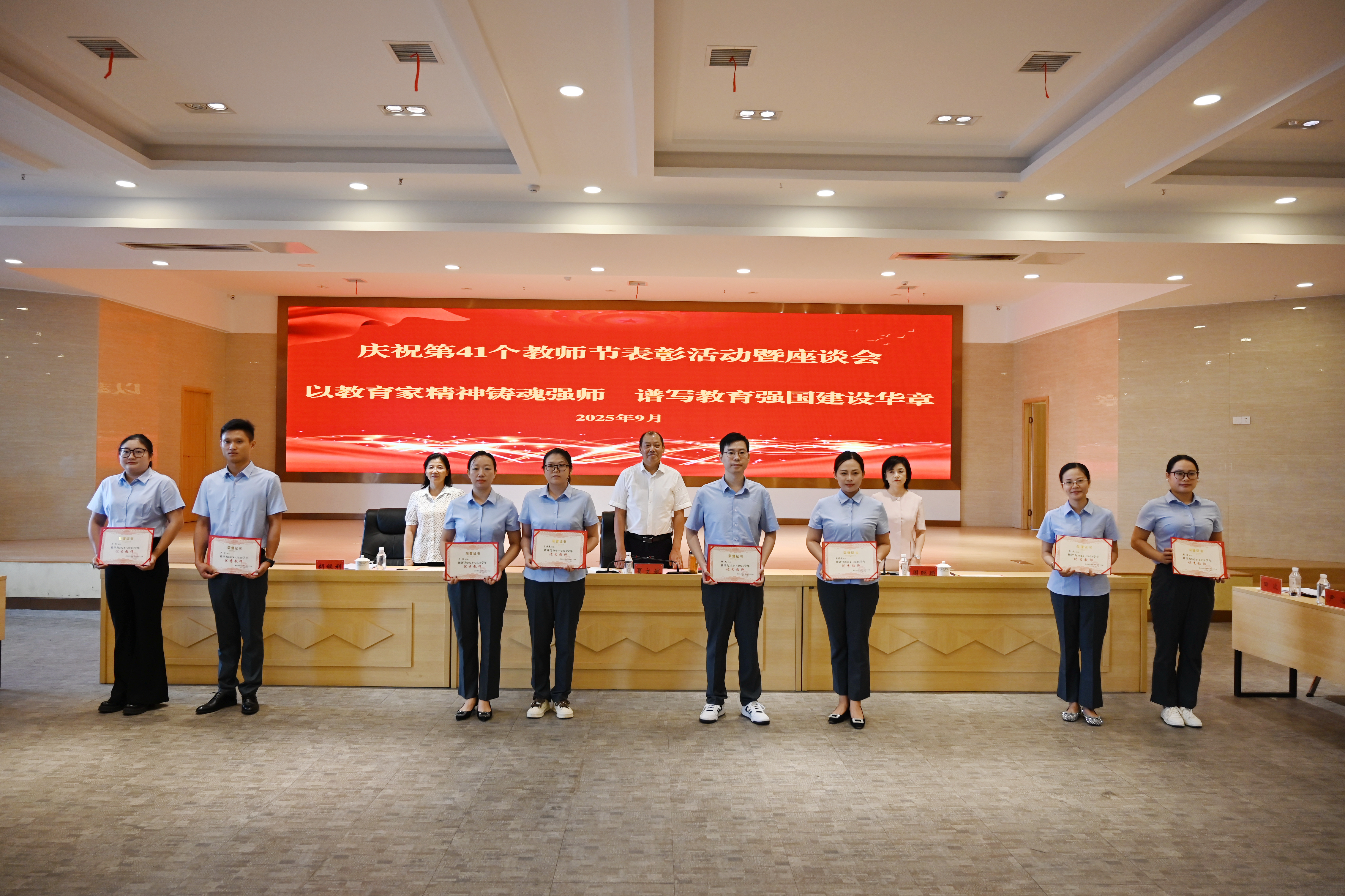 9月10日上午,我校庆祝第41个教师节表彰活动暨座谈会在多功能厅举行。省发展和改革委员会党组成员,省粮食和物资储备局党组书记、局长夏文斌,办公室、财务处负责同志来校与全体师生共同庆祝教师节。参加座谈会的还有学校全体领导、优秀教师、优秀班主任及部分先进个人代表。会议由省粮食和物资储备局办公室主任周聪颖主持。
