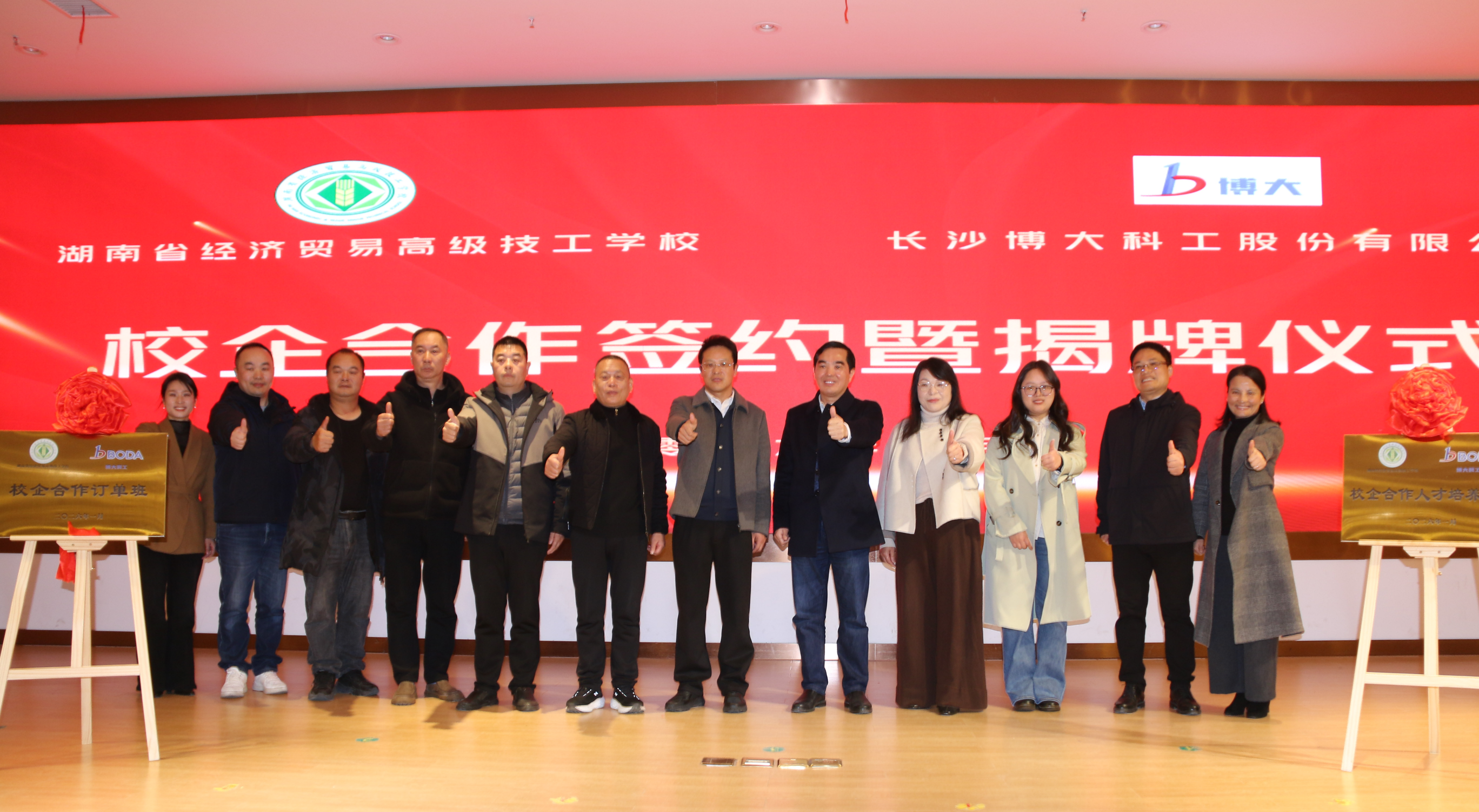 1月12日上午,我校与长沙博大科工股份有限公司校企合作签约暨揭牌仪式在学校多功能厅隆重举行。双方将围绕智能制造加工领域,在人才培养、实习实训、技术研发等方面开展深度合作,共同致力于培养高素质技术技能人才,服务区域产业发展。长沙博大科工股份有限公司董事长蒋剑锋、董事长助理梁晓红、人事总监赵美华等企业代表,我校党委书记、校长童国平、副校长伍嗣宏、肖力青,相关科室负责人、专业教师代表及订单班学生共同出席了仪式。
