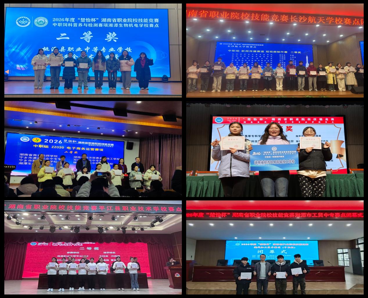 刚刚落幕的2026年“楚怡杯”湖南省职业院校技能竞赛中,我校代表队凭借扎实的专业功底,精湛的技能水平和出色的现场发挥,在全省众多参赛院校中脱颖而出,取得了令人瞩目的优异成绩:一等奖1项,二等奖6项,三等奖9项,共计16个大奖,充分展示了我校卓越的办学实力和师生昂扬向上的精神风貌。