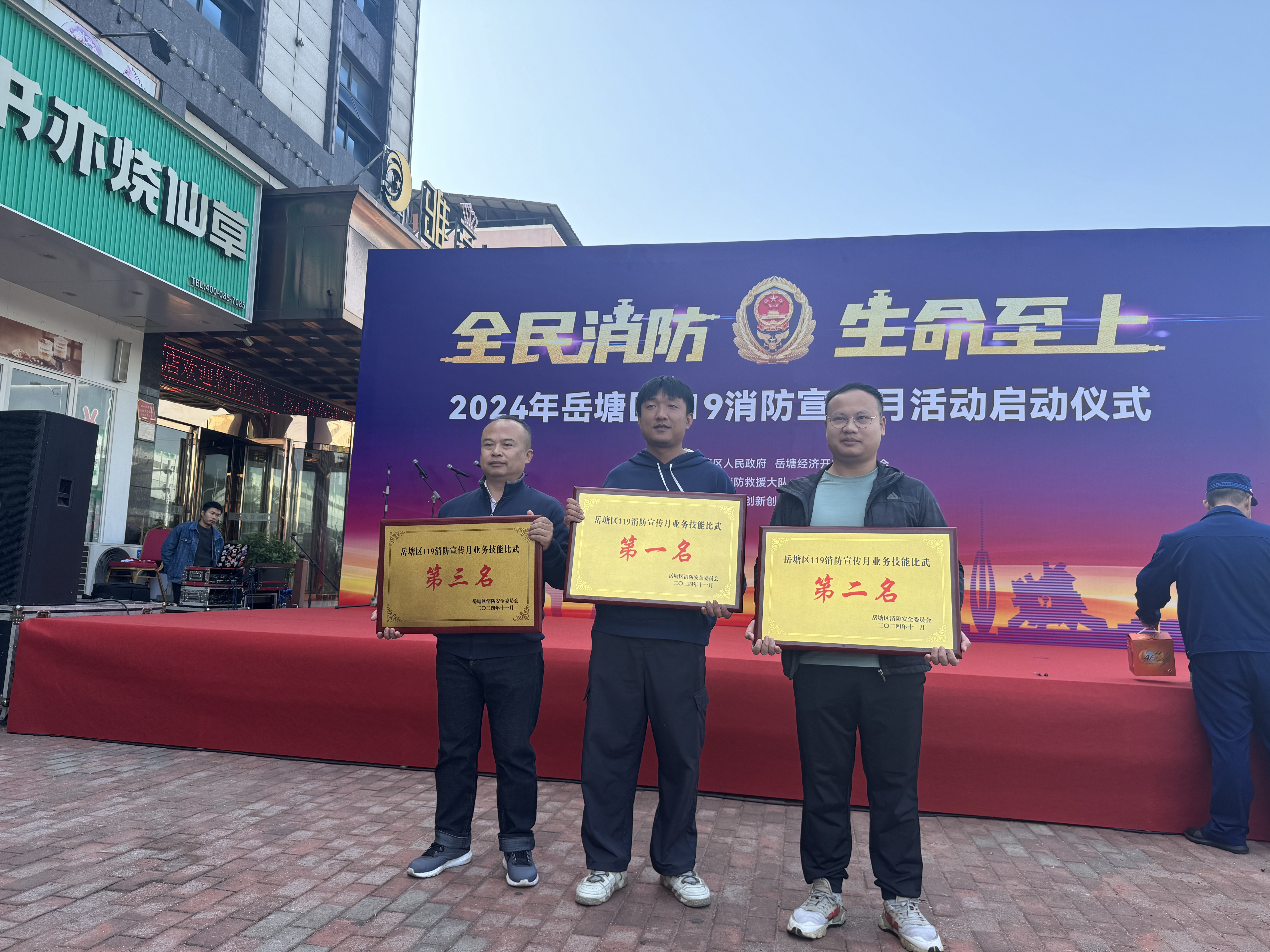 喜报——我校选手在岳塘区119消防宣传月业务技能比武中斩获第一名